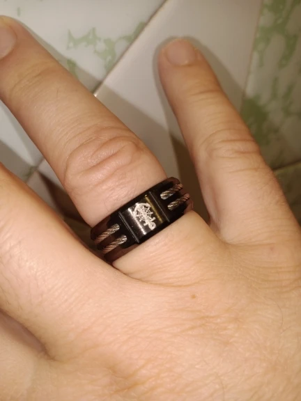 Доставка товара чуть меньше месяца. Доставка почтой. Упаковано в фирменный чехольчик. Кольцо описанию и картинкам с сайта соответствует, но на фото оно выглядит более эффектным. Кольцо, довольно, неплохого качества. Приятное. Ожидалось, что оно будет немного уже. В кольцо врезаны стальные кусочки тросиков, очень интересный подход. Когда тросики потемнеют, кольцо приобретет свой шарм. Сидит кольцо неплохо, но оно реально широкое. Уменьшить бы ширину и оставить один тросик, по центру, был бы еще один, хороший, вариант для добавления в фирменную коллекцию продавца. В подарок положили пластмассовую бусину. Продавцу спасибо за быструю доставку.