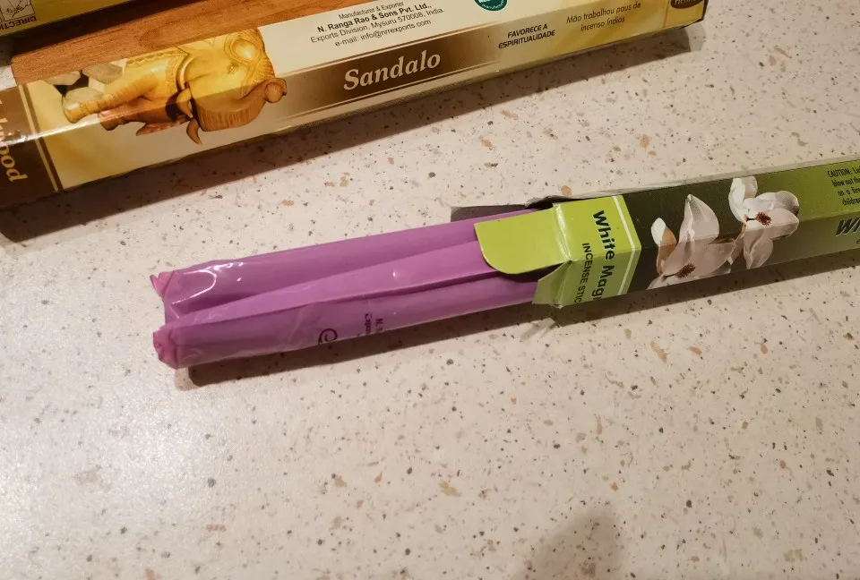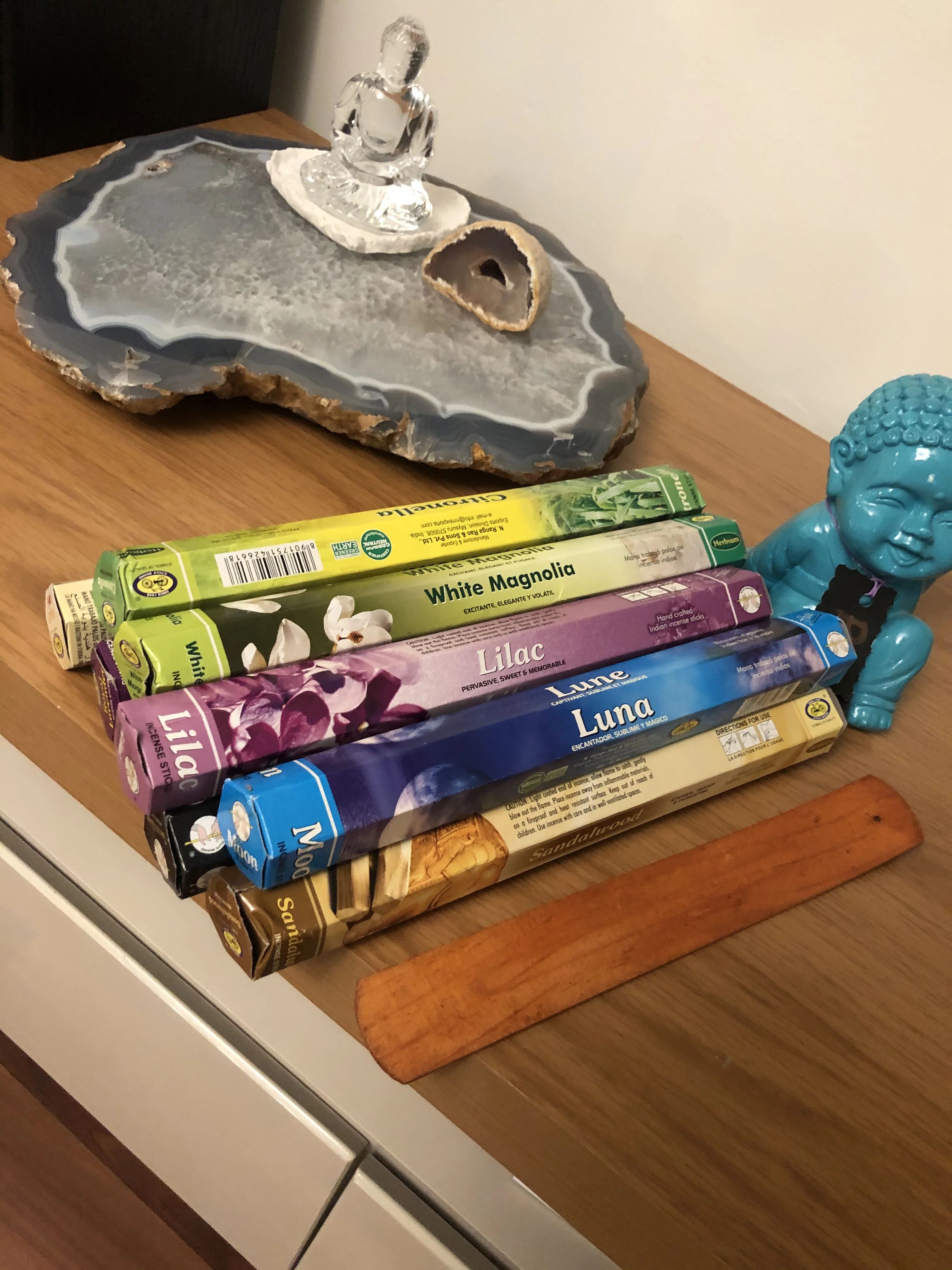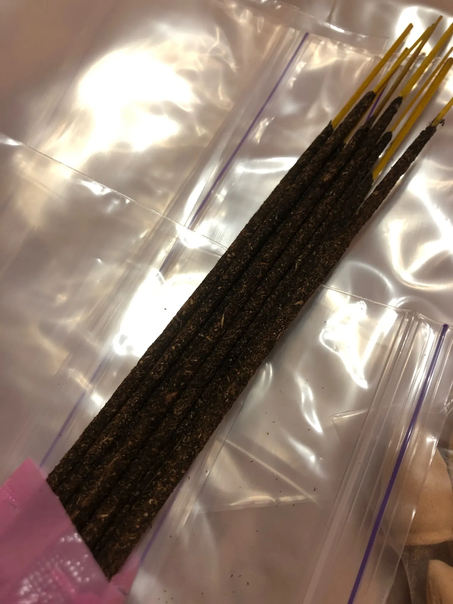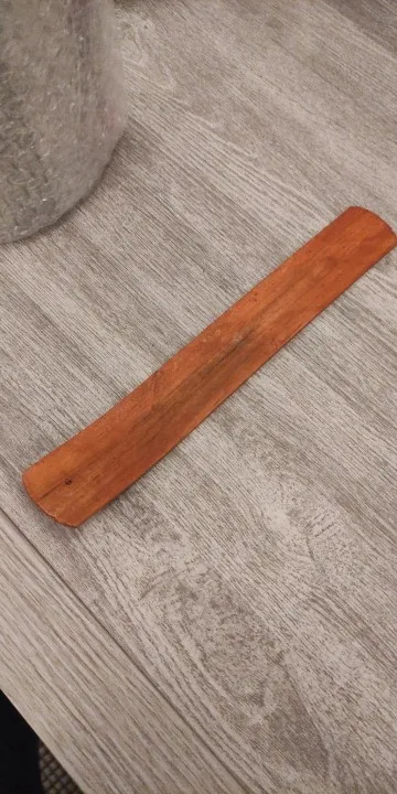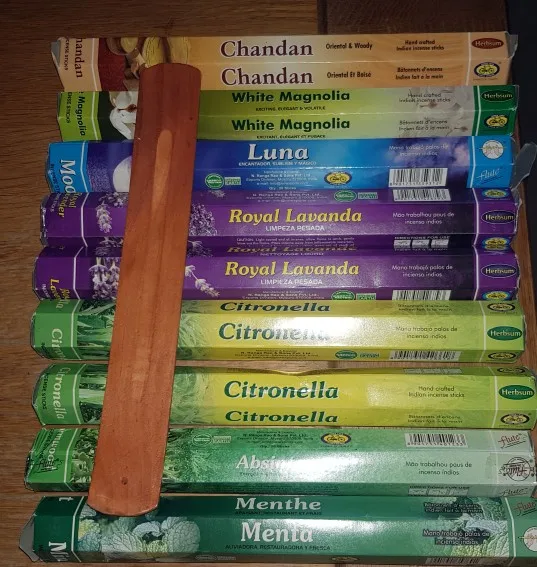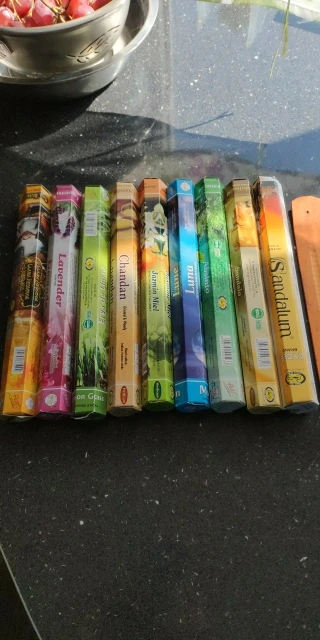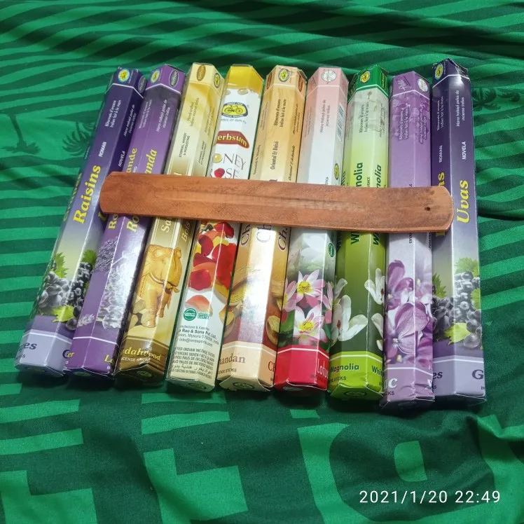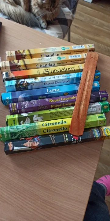Посылка добиралась 55дней(слишком долго) Все приехало в хорошем состоянии, стоило открыть упаковку как запах разошелся на всю комнату). Деревьяная подставка непримечательная. Эффект приятный, араматов много. Толщина палочек разная, складывается впечатление что горят с разной скоростью по причине толщины деревяшки.