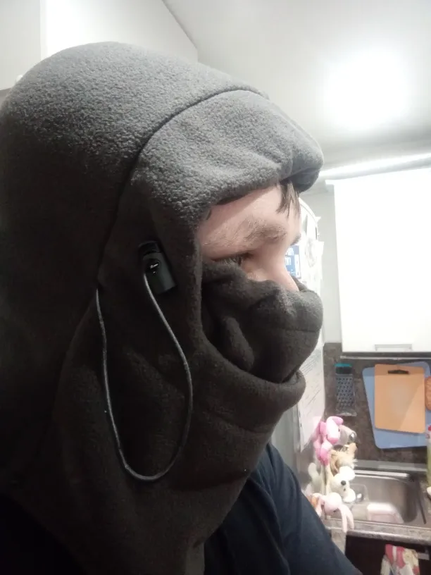Балаклава очень классная. Удобная, тёплая. Советую. Можно как полностью закрыть лицо (кроме глаз), так и оставить часть лица открытым. Сзади и сбоку шея закрыта, поэтому ничего не продувается. По бокам есть резинки, которые регулируют затяжку Балаклавы.