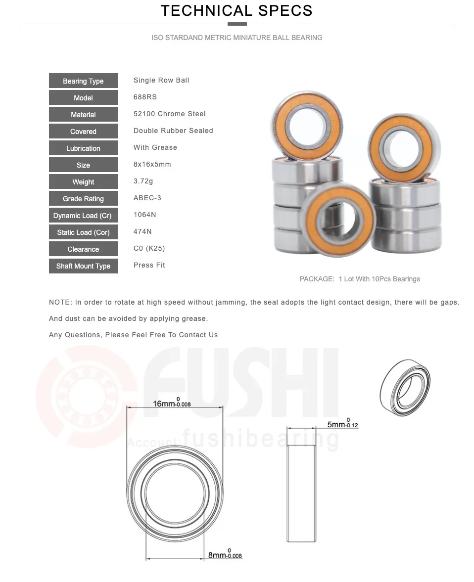 688-2RS подшипник ABEC-3 10 шт. 8x16x5 мм миниатюрные 688RS шарикоподшипники 6188RS Z3V3 оранжевый герметичный подшипник 688 2RS