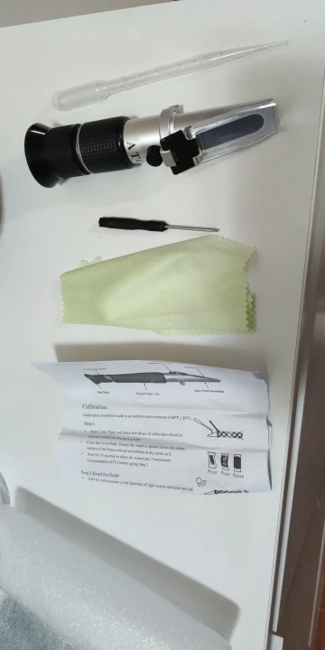 Хорошее качество и получил быстро, но руководство неправильно. Нет необходимости калибровать дистиллированную воду. Если вы коснулись винта, вы можете повторно откалибровать рефрактометр с дополнительным оливковым маслом, его Brix составляет от 71 до 72.