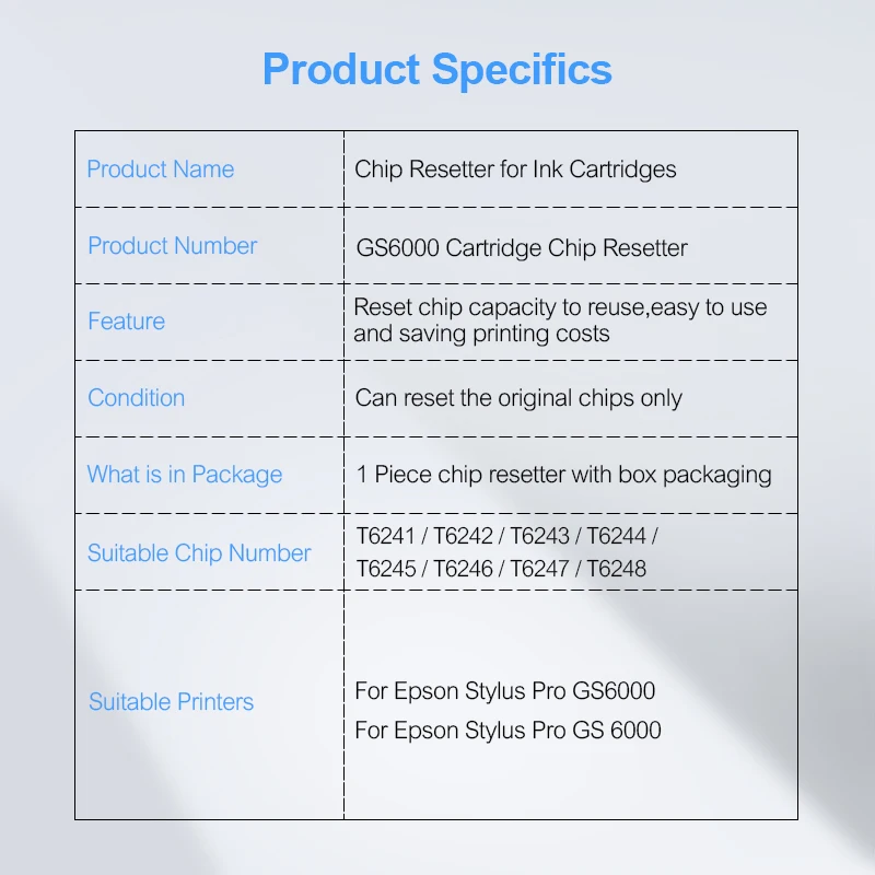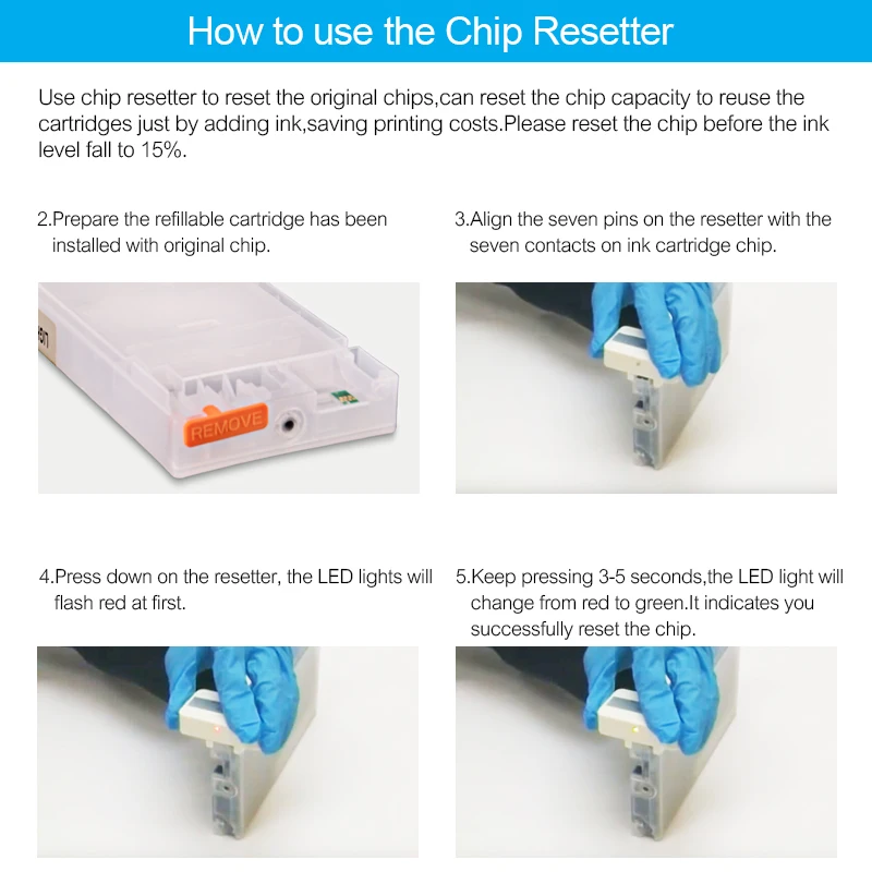 Используйте сброс чипа для сброса оригинальных чипов, можно сбросить емкость чипа доПовторно Используйте картриджиДобавление чернил, экономия затрат на печать.