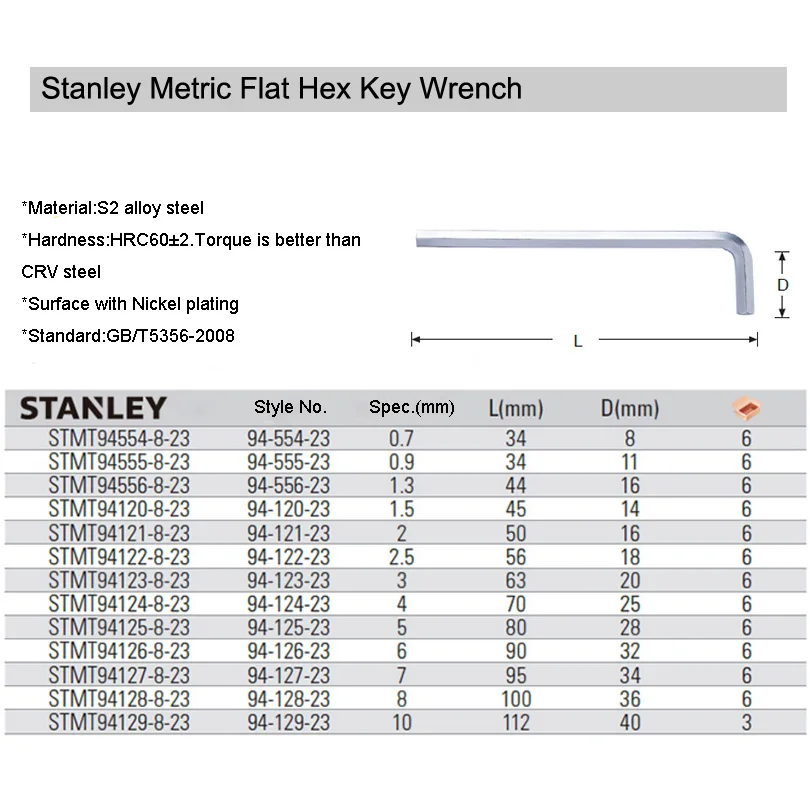 Стэнли 1 шт. мини короткий плоский шестигранный ключ метрический 0,7 мм 0,9 мм 1,3 мм 1,5 мм 2,0 мм 2,5 мм 3 мм 4 мм 5 мм 6 мм 7 мм 8 мм 10 мм S2 легированная сталь