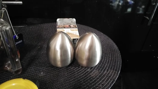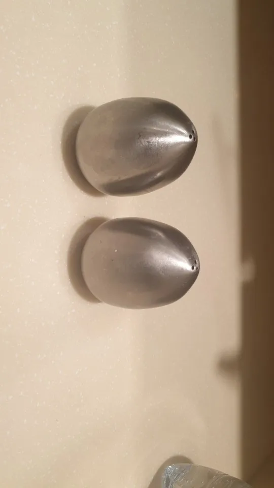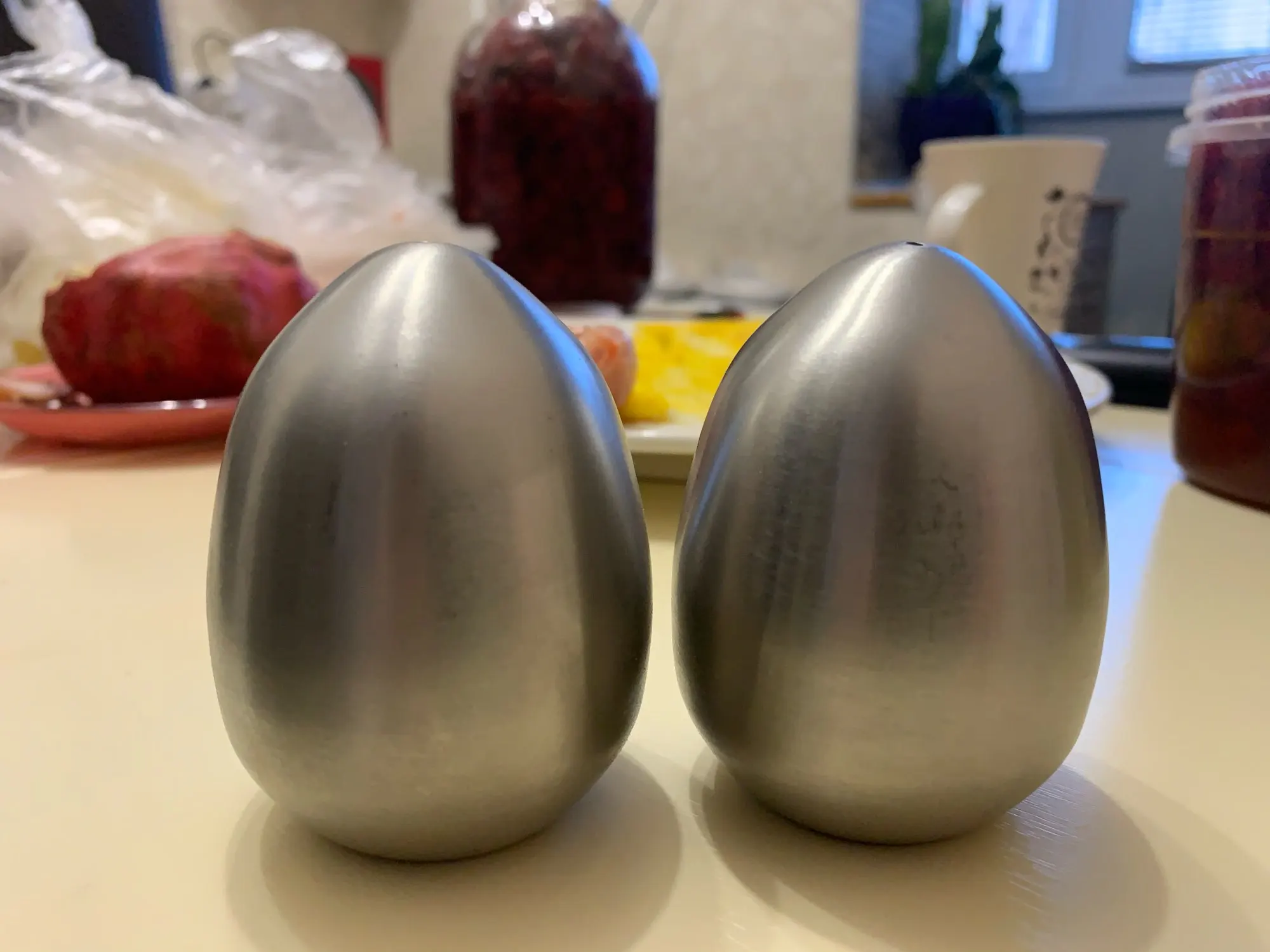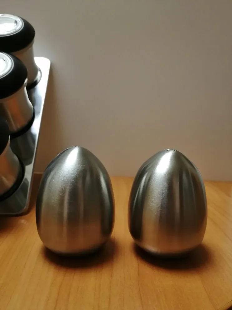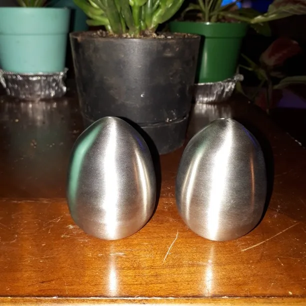Набор очень понравился, оригинальный и весёленький - для соли, перца и хорошего настроения) Описанию соответствует, нержавейка обработана качественно, дефектов нет. Яйца заметные - 8см в высоту, 6см в ширину, ровненькие, сделаны очень аккуратно. Дырочки не маленькие, я засыпала каменную соль и перец среднего помола. Закрываются плотно, пластиковыми фиксаторами. Доставка полтора месяца, трек отслеживался до нашей границы. Каждое яйцо пришло в отдельном пакетике, плюс оба обёрнуты мягким вспененным полиэтиленом. Продавцу большое спасибо, набор советую - на любой кухне будет смотреться отлично.