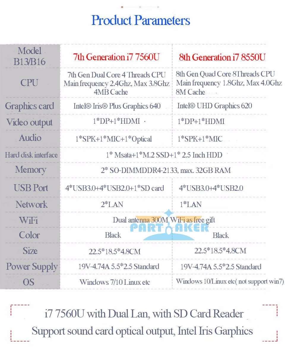 Номер модели: причастник B13Цвет: серебристыйМатериал: алюминийЦП: процессор Intel Core i5-7260U (кэш 4 Мб, до 3,40 ГГц)Графика: Intel Iris Plus Graphics 640Память: 2 * SO-DIMMDDR4-2133, макс. 32 Гб RAMХранение: 1 * Msata/M.2 SSD + 1*2,5 дюйма HDDРасширение: 1 * MSATA3.0, 6 ГБ/сек.; 1 * SATA3.0, 6 ГБ/сек. + 1 * ngff nvme 2280 M.2 SSD, 1 * Wi-Fi модульАудиокарты: 6-канальный звук с чипом ALC892Сетевая карта: RTL8168/8111/8112 PCI-E 10/100/1000 Gigabit Ethernet NICWi-Fi: с двумя антеннами, 802,11. b/g/n, встроенный модуль с внешними антеннами для усиления сигналаBluetooth: необязательно (по умолчанию без этой функции, пожалуйста, оставьте нам сообщение в заказе, спасибо)Порт I/0: 2 * LAN + DP + HDMI + 4 * USB 3,0 + 4 * USB2.0 + 1 * оптический + 1 * кардридер SD + Spk + микрофонМощность: DC100-240V AC/50-60Hz, DC 19V/4.74AРабочая температура: 0 °C ~ 70 °C по Цельсию (32 °F ~ 140 °F)Температура хранения:-20 °C ~ 80 °C по Цельсию (-68 °F ~ 176 °F)Относительная влажность: 10% ~ 90% (без конденсации)Подставка для мини-ПК: ДаКрепление Vesa: опциональноВес: 2,5 кгРазмеры: 200*170*45 ммПотребление: 15 ВтДизайн материнской платы: без вентилятораФункция: 1. Поддержка бездисковой загрузки2. Поддержка включения питания (восстановление потери мощности переменного тока)3. Поддержка RAID0Гарантия: 3 годаПоддержка системы: Windows 7/8/8.1/10,WES7/8,Linux Ubuntu,Vxworks и т. д.;Системный вариант по умолчанию: Windows 10 pro как вариант по умолчанию;Внимание: Barebone, одиночный модуль оперативной памяти, одиночный SSD или SSD + HDD без какой-либо системы.Linux ubuntu или другая ОС, пожалуйста, оставьте нам сообщение в заказе, спасибо.