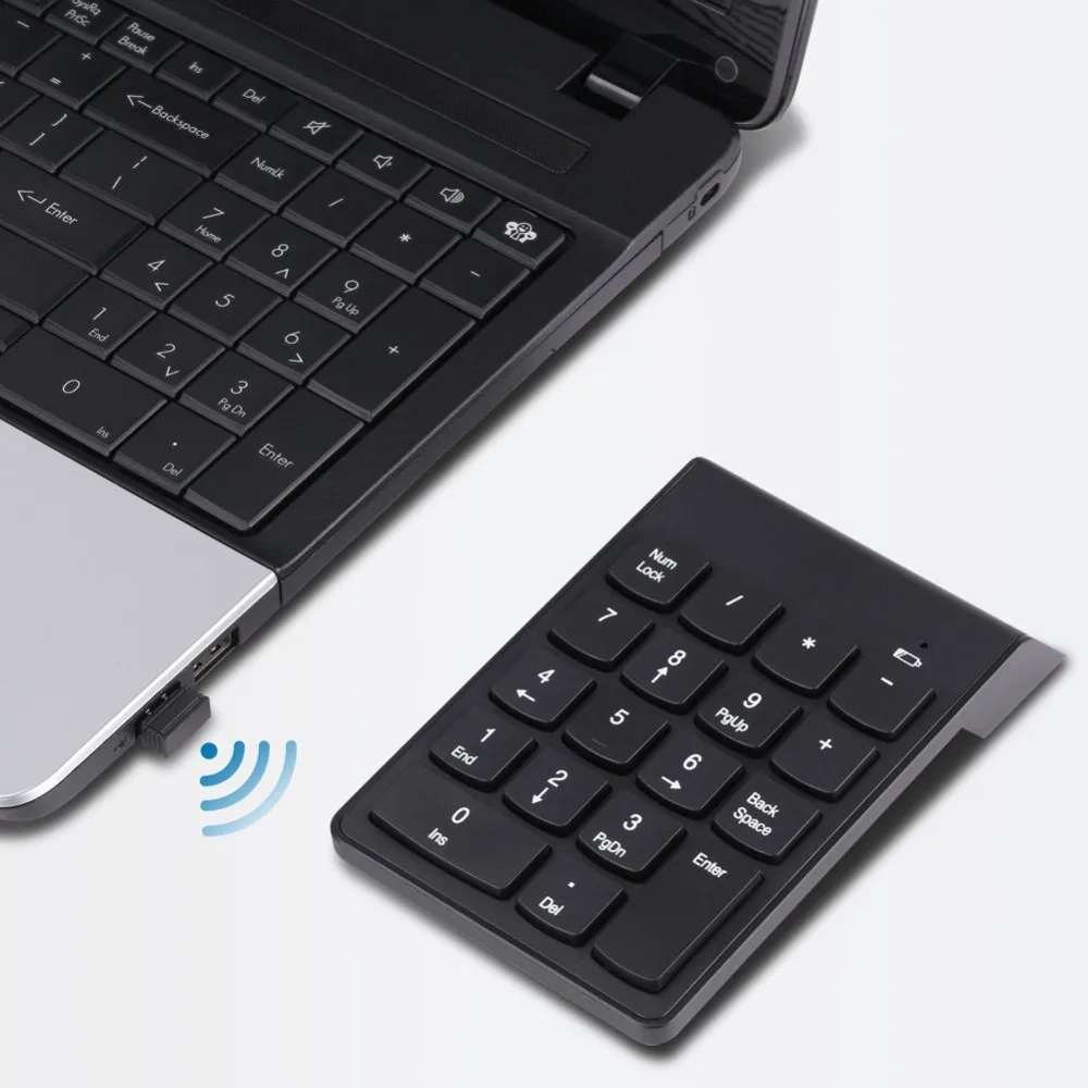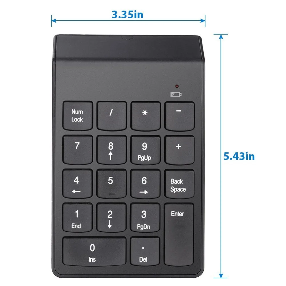 100% новый и высокое качество Компактный, удобный в использовании и удобный в переноске Поможет вам работать с цифрами более профессионально и эффективно, где бы и когда бы то ни было Клавиатура поставляется с 18 клавишами 0-9 цифр, Del, Enter, Num Lock, Backspace, + - */ Простая подключи и работай, никаких требований к установке драйвера Беспроводной передачи должен быть оплачен покупателем, чувствительный, на расстоянии до 10 метров рабочее диапазон Лучше всего подходит для пользователей ноутбуков, которые всегда работают с цифровыми клавишами/мини-клавиатурой Ключ "Num Lock", Переключение на номер (0-9) функции и другие функции.Спецификация: