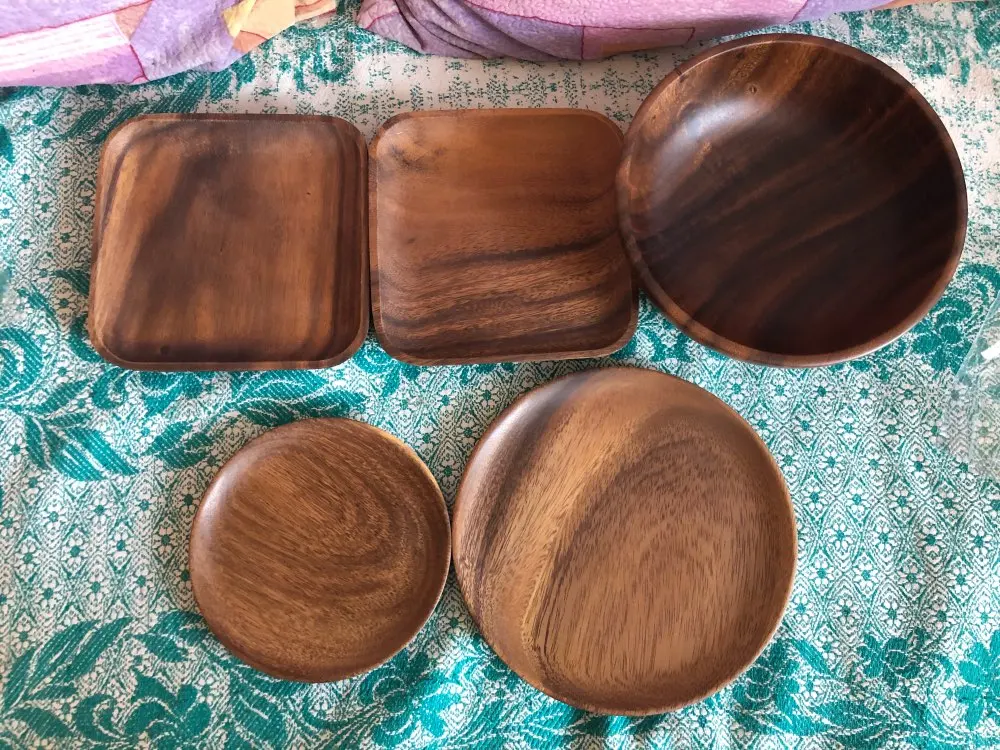 Влепила 3 за то что шло очень долго и за то что когда просила снизить цену ещё, то не согласился, а сейчас этот комплект дешевле аж на 20$ !!!... Эта тарелка понравилась, но запах странный лака, не пахнет деревом.
