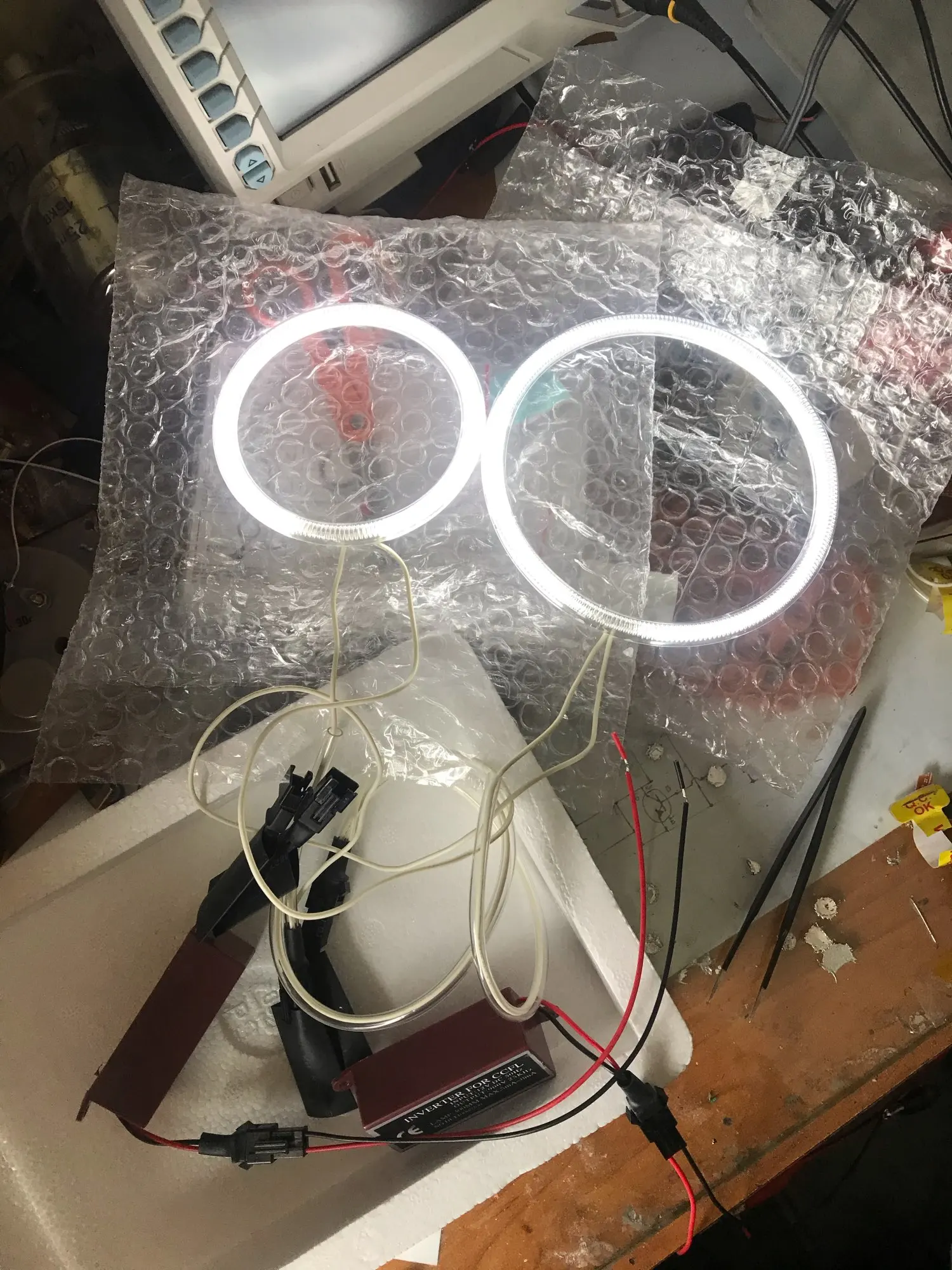 Они хорошо работают. Продавец включает в себя грубые инструкции по монтажу и двухсторонние липкие прокладки для крепления колец. Однако я замечал, что большое кольцо не светится так ярко, как маленькое. Возможно, он может быть сбалансирован резистором. Лампы начинаются немедленно без мерцания