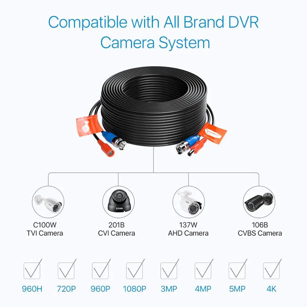 Комплект видеокамер ZOSI 100FT 30 м с разъемом BNC, кабель питания для видеонаблюдения, видеорегистратор