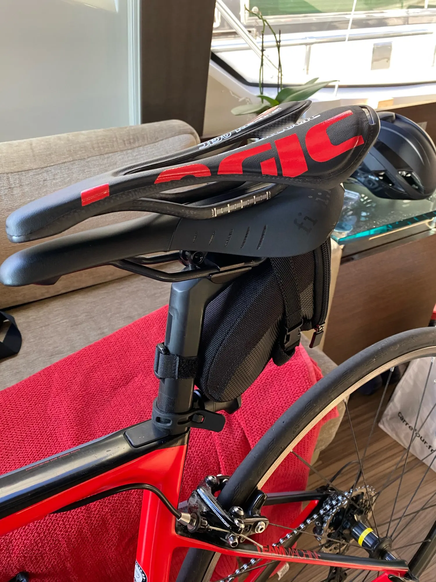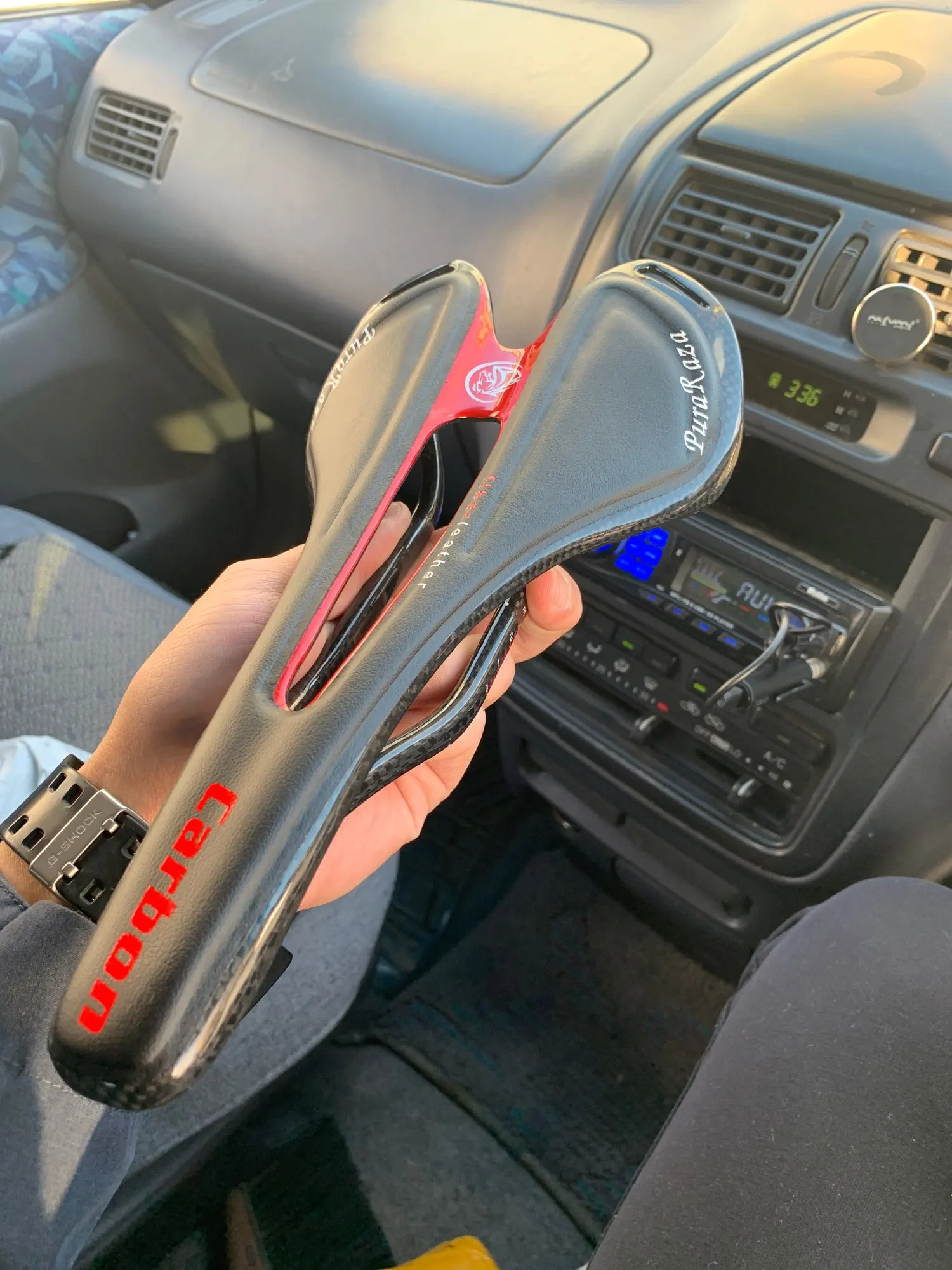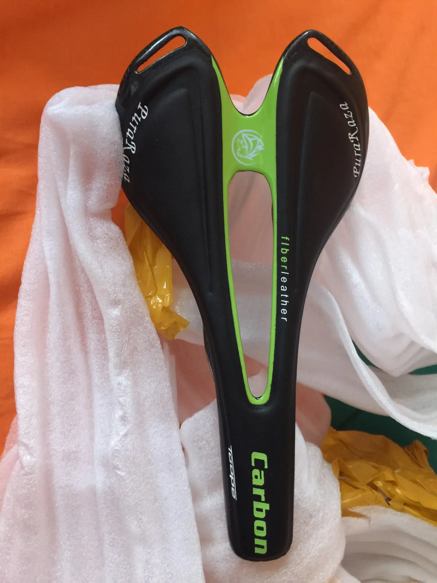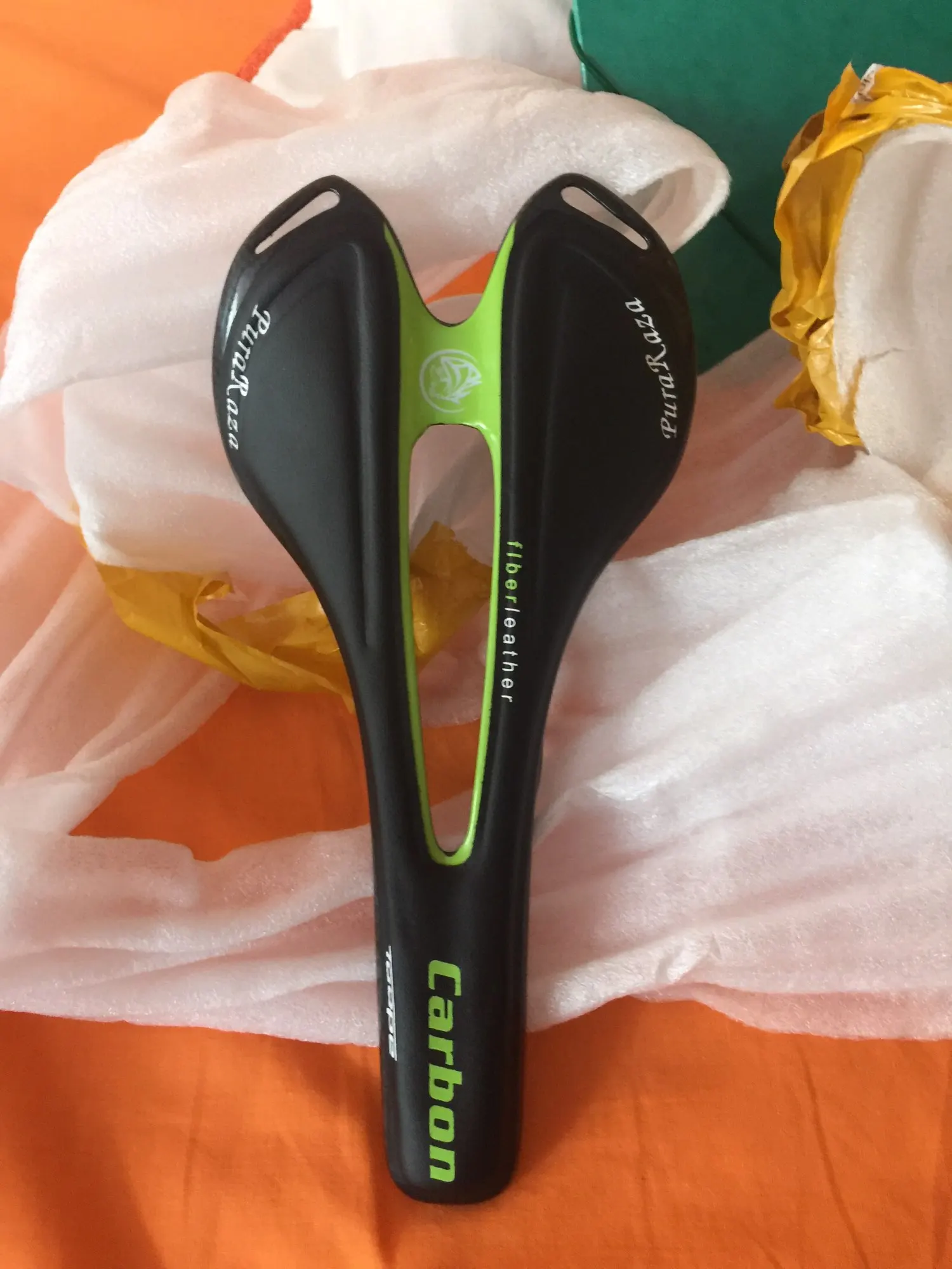 Седло действительно карбоновое. Легкое. Обшивка из кожзама. Приклеена не особо аккуратно