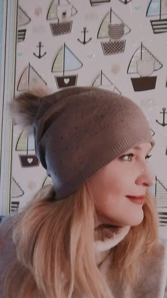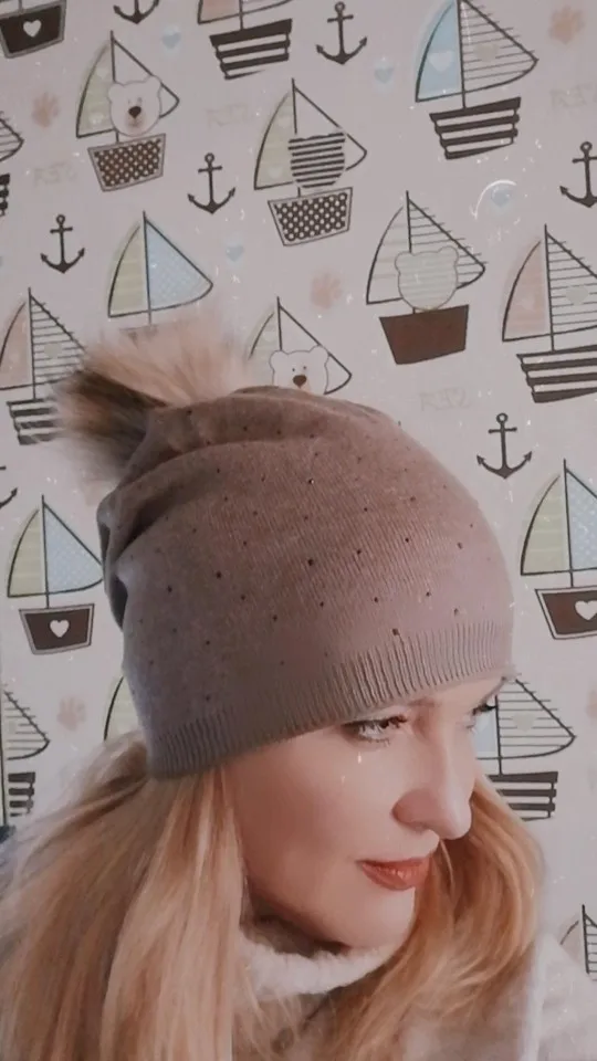 Шапочка супер, очень нравится! Вязка мелкая, аккуратная, не растянется. На подкладке. Сзади застрочены складки, шапка держит форму. Стразики маленькие по всей шапочке, красиво. Помпон на кнопке. Отлично смотрится. Самое главное - не давит на голову. Большое спасибо продавцу, рекомендую! 5+++++