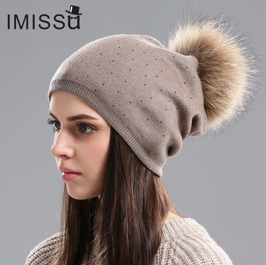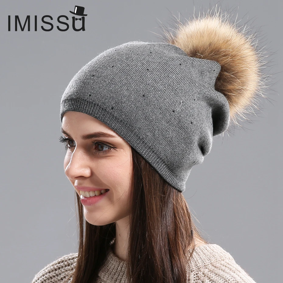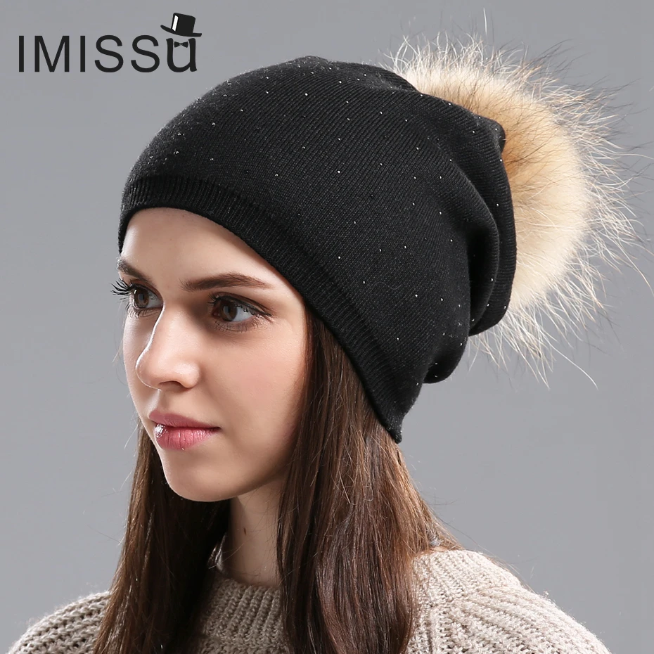 IMISSU Женщин Зимняя Шапка Шерсть Вязаный Шапочки Кап Реального Ракун мех Помпон Шляпы Сплошным цветом Горнолыжные Gorros Крышка Женский Причинной шляпа