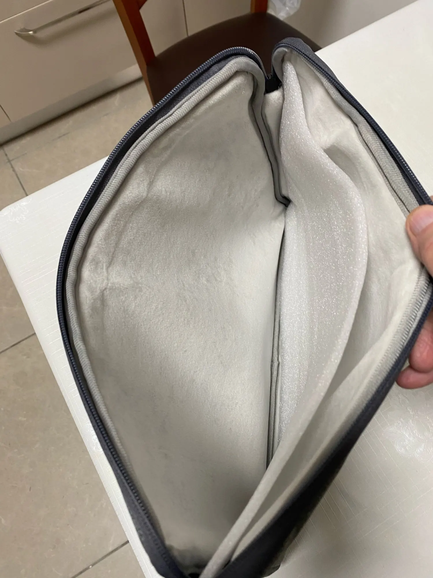 Размеры точно такие же, как в описании, цвет не совсем такой, как я бы называл темно-синий, но более темно-серый, но это также очень хорошо. Внутренняя часть очень гладкая, и, безусловно, есть пенопласт между внешней и внутренней тканью. Доставка во Францию занимает всего 10 дней. Я бы оценил его 6 звезд!