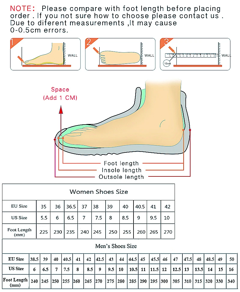 Мы адаптируем европейскую стандартную таблицу размеров обуви, мы предлагаем вам выбрать размер в соответствии с нашей таблицей размеров обуви. Пожалуйста, измерьте длину вашей стопы и сравните длину вашей стопы с таблицей размеров на нашем phoro. Спасибо; Из-за различных методов измерения допускается погрешность в 0,5-1 см; Если у вас полная или широкая стопа, пожалуйста, выберите обувь на один размер больше; Пожалуйста, учитывайте, что цвет может немного отличаться из-за различных камер или светильник.