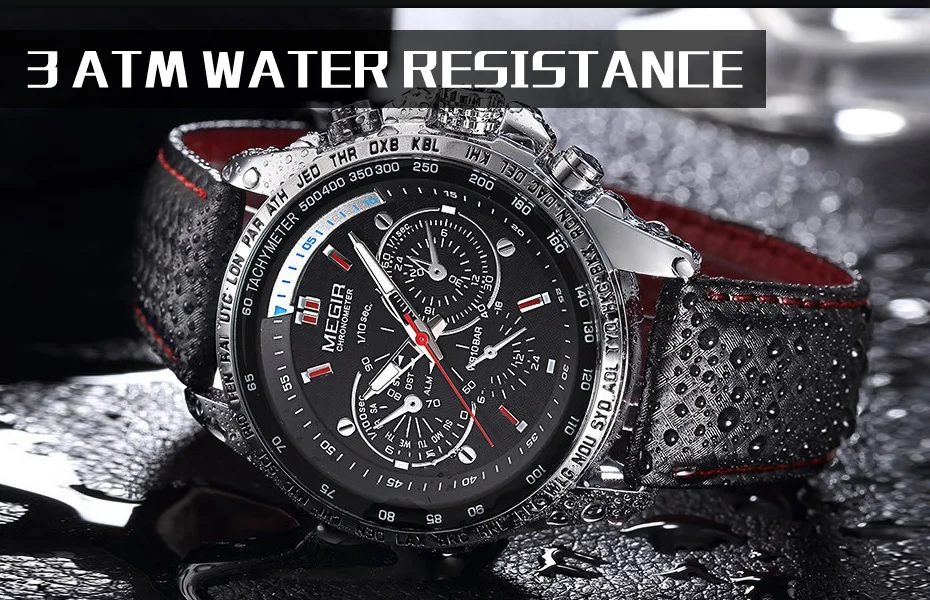 Часы MEGIR Мужские кварцевые спортивные, брендовые Роскошные модные повседневные Черные с ремешком из ПУ кожи, с большим циферблатом, 1010