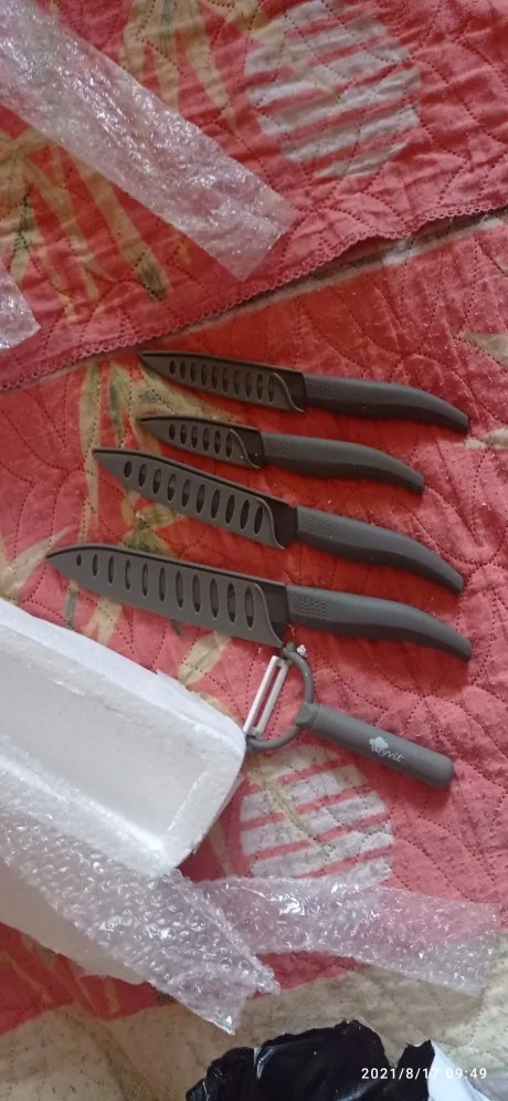 Заказ пришёл быстро, недели за 2,5, раньше, чем было указано. Упаковано было отлично, ножи пришли без единой царапины. С продавцом общаться не пришлось. Полностью соответствуют описанию и фотографиям. Режат даже помидоры и мясо как мягкое масло. Я ооочень довольна!!!