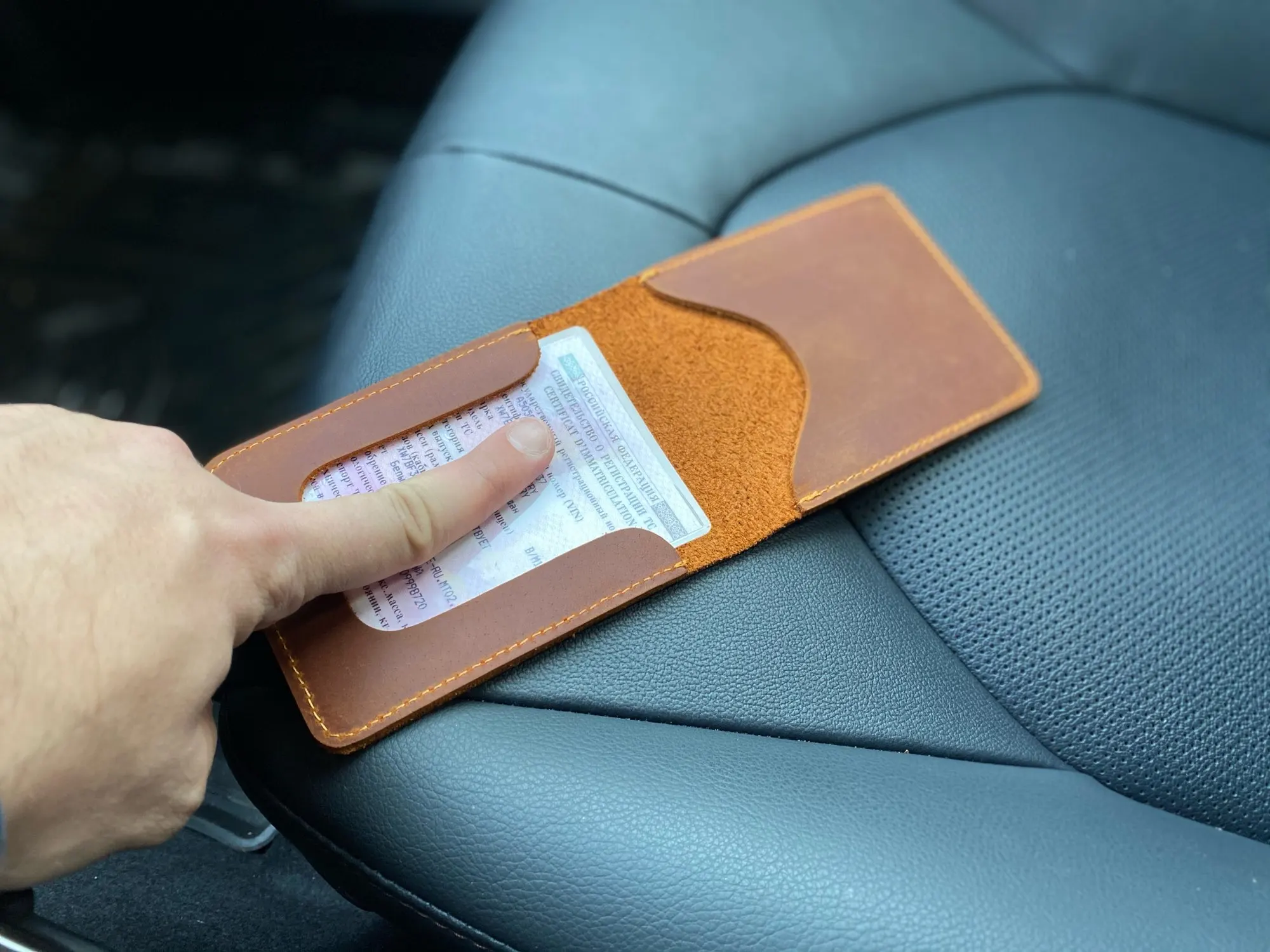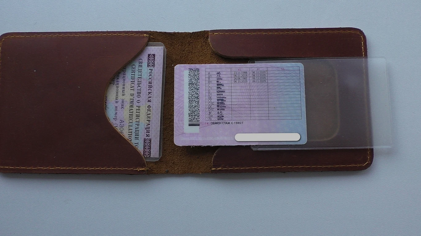 Отличное качество, мягкая толстая кожа - все отлично. Цвет чуть светлее, чем на фото, но некритично. Свидетельство о регистрации влезает точно, паспорт РФ уже нет. Для авто-документов - отлично.