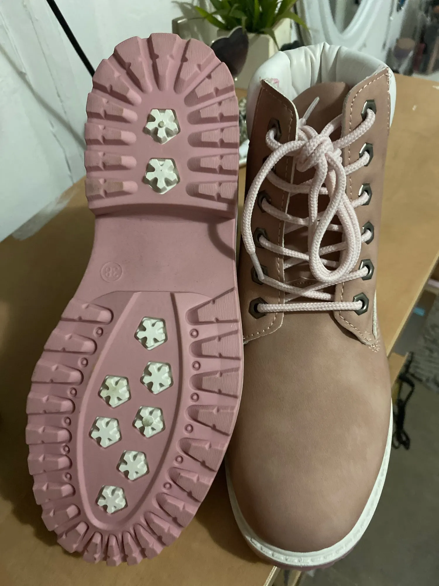 Заказывала ботинки с мехом пришли без( Шнурки порвались на 2 день. Подошва тонкая, если идти по снегу, снег на неё прилипает прям по середине, это очень неудобно. Ходила в них в - 5, не замёрзла конечно, но было прохладно... Размерная сетка точная. Заказ отправили быстро, пришёл за 20 дней в почтамат. Выглядят вроде неплохо. Но зашнурованные на ноге смотрятся некрасиво (3 фото). Относила неделю, уже заломы появляются...