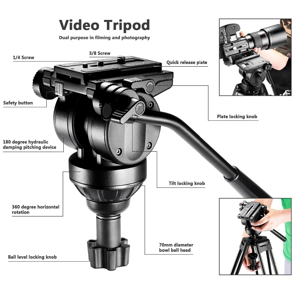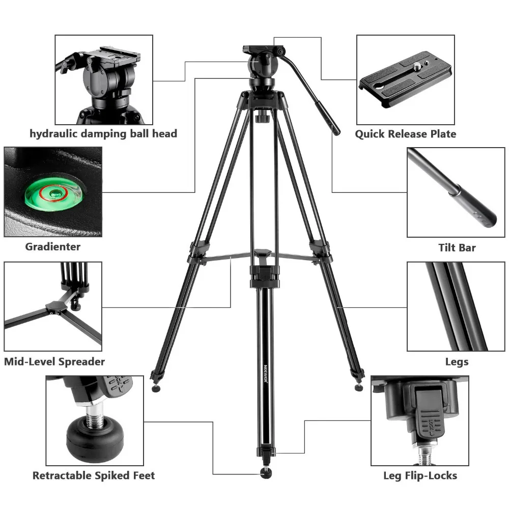 Профессиональный штатив Neewer для видеокамеры из алюминиевого сплава, 61 дюйм155 см, 360 градусов, жидкостное сопротивление головки 14 + 38 дюйма, быстросъемное крепление