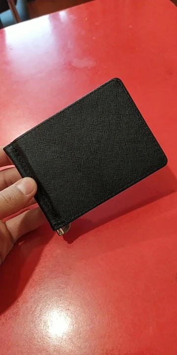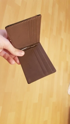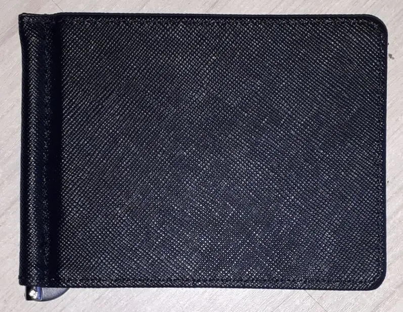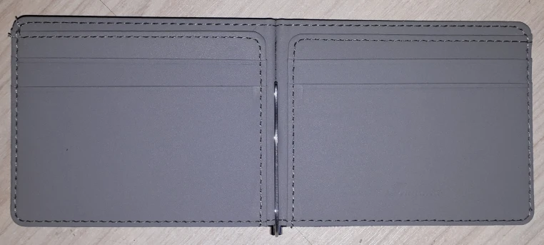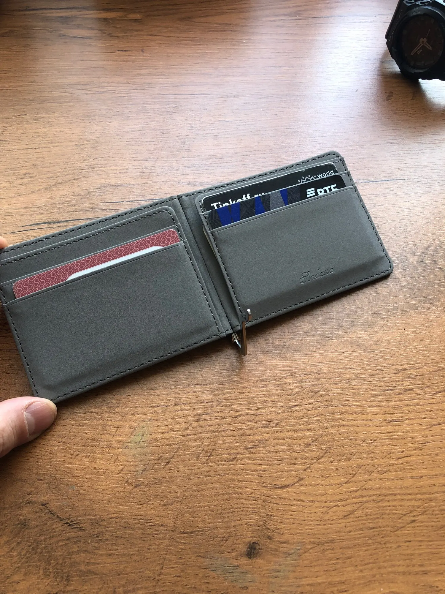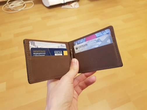 Пришёл в срок, трек отслеживался. Кошелёк оправдал ожидания. Маленький компактный на пару карт и несколько купюр. Кармашки точно под банковские карты, ни больше и ни меньше. Думал клипса будет умеренной жесткости для того чтобы легко вытаскивать купюры, но она на пружине отщёлкивается и плотно прижимает банкноты