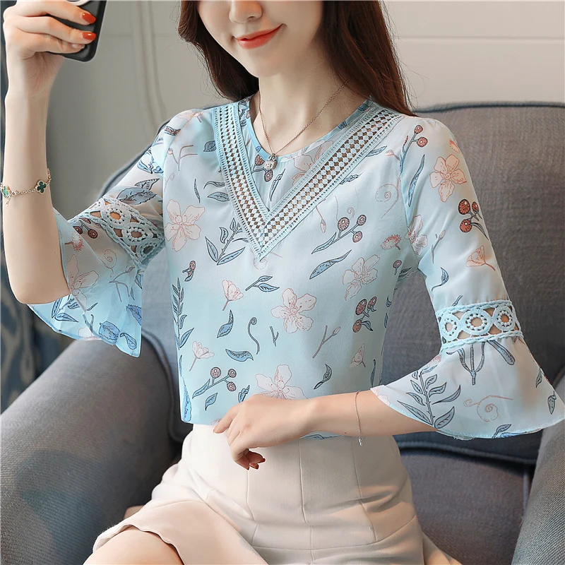 2021 модная шифоновая блузка с принтом, женская рубашка с расклешенными рукавами, летние женские топы, шифоновые женские блузки с вырезами, рубашки, блузы 0278 40
