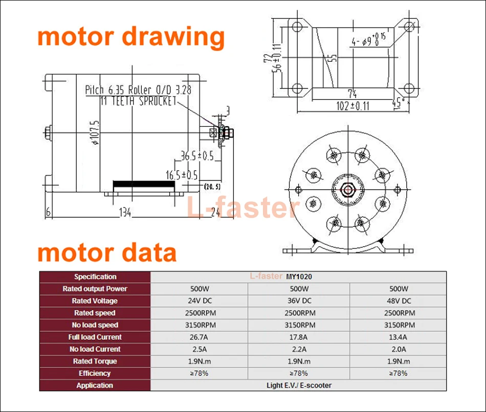 Модель: MY1020Напряжение: 24/36/48 вольт постоянного токаМощность: 500 ВтЗвездочка: 11 зубьев, подходит для велосипедных цепей № 25H(Мы предоставим звездочку T8F в подарок)