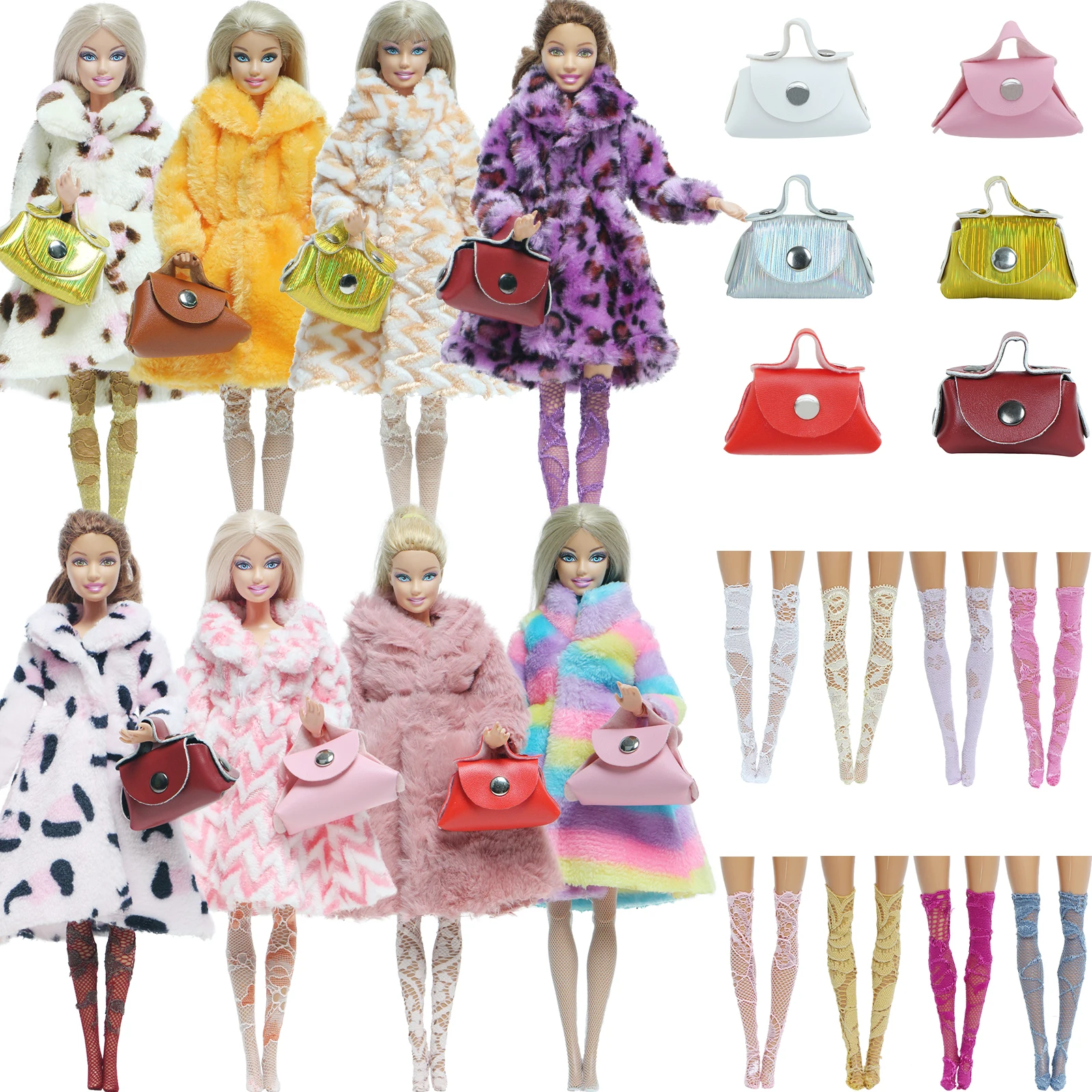 7 шт.компл. = 1 шт. шуба + 1 Сумочка + 5 случайных пар кружевных носков, леггинсов, шелковых чулок, Одежда для кукол Барби, игрушки сделай сам