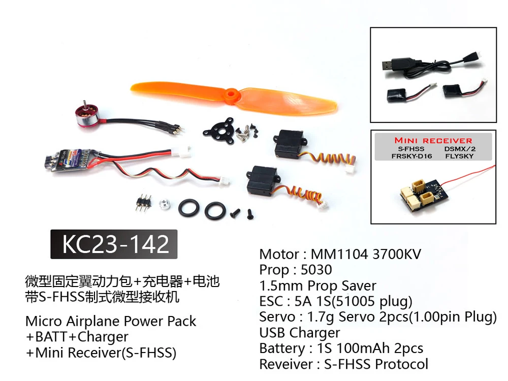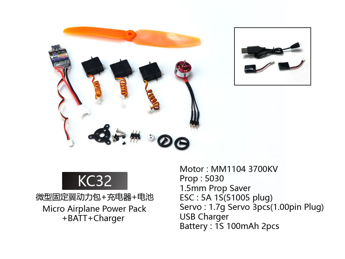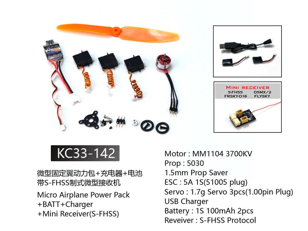 KC33-142= Двигатель (MM1104 3700KV)+ ESC(1S 5A)+ Serco (1,7g)* 3 шт. + Prop (5030)+ аккумулятор + зарядное устройство + микроприемник (S-FHSS)