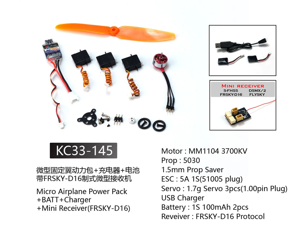 KC33-145= Двигатель (MM1104 3700KV)+ ESC(1S 5A)+ Serco (1,7g)* 3 шт. + Prop (5030)+ аккумулятор + зарядное устройство + микроприемник (Frsky D16)