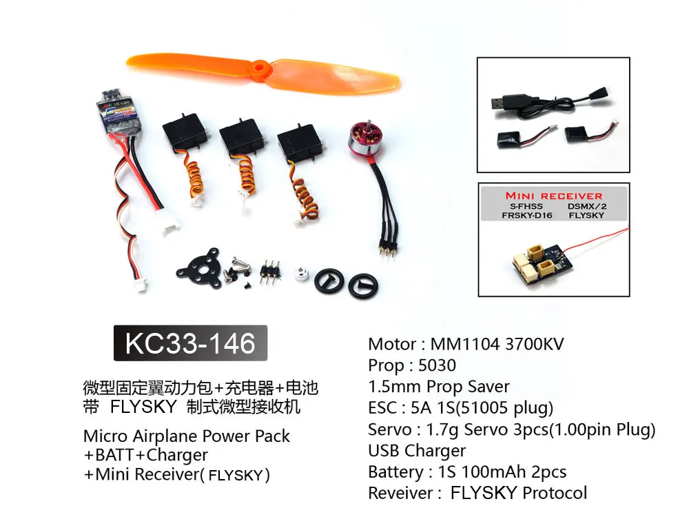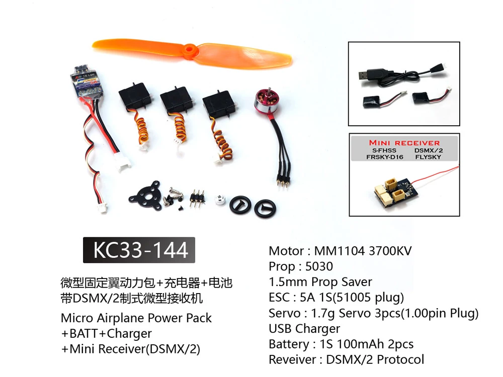 KC33-144= Двигатель (MM1104 3700KV)+ ESC(1S 5A)+ Serco (1,7g)* 3 шт. + Prop (5030)+ аккумулятор + зарядное устройство + микроприемник (DSMX)