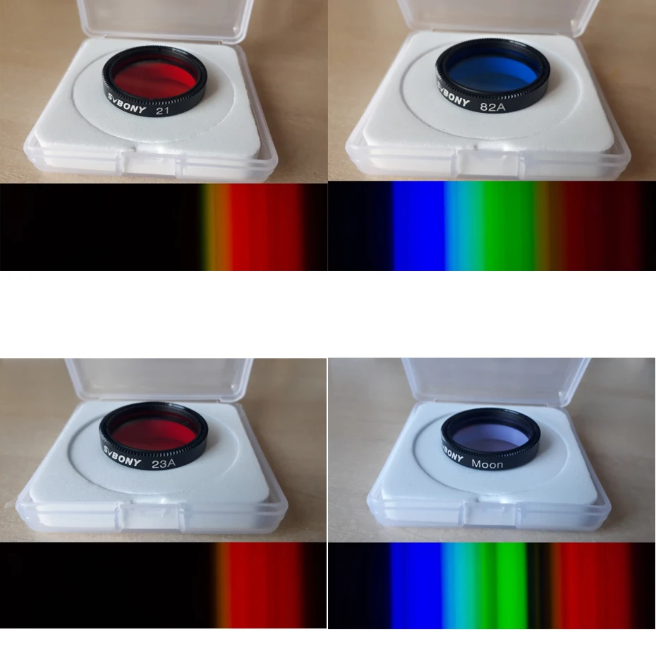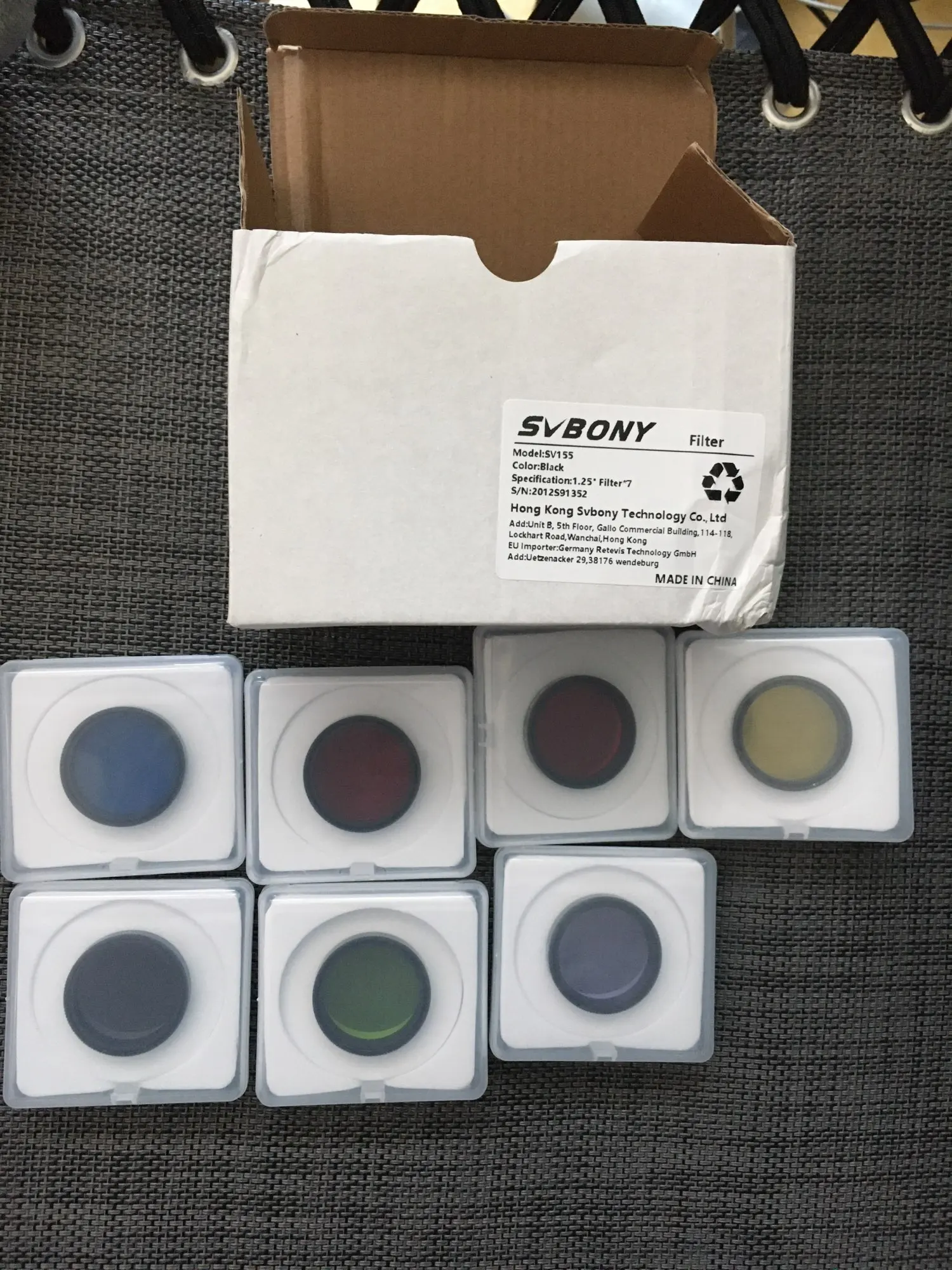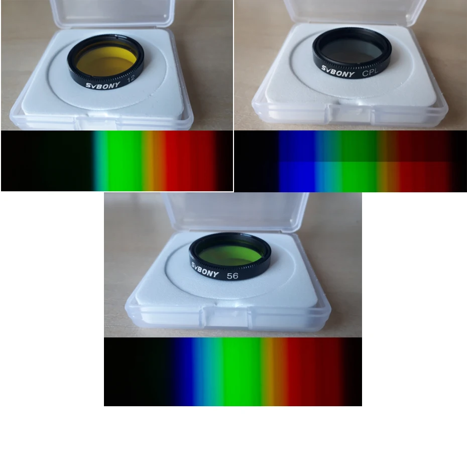 SVBONY 1.25-дюймовый набор фильтров для телескопа из 7 предметов - 5 цветных фильтров, лунный фильтр и фильтр CPLВысококачественная рама из алюминиевого сплава и оптическое стекло, отличное соотношение цены и качестваЦветовые фильтры (красный, синий, зеленый, оранжевый и желтый) выделяют особенности на Марсе, Юпитере и Сатурне.CPL-фильтр усиливает контраст луны и планет на фотографических изображениях.Лунный фильтр улучшает обзор лунных планет, устраняя смог уличного фонаряСтандартная резьба фильтра 1,25 дюйма для окуляров 1,25 дюйма и других принадлежностейЭти 1,25-дюймовые фильтры SVBONY включают в себя самые популярные цветные фильтры для окуляров планетарных и лунных телескопов: 23A ярко-красный 21 оранжевый 12 желтый 56 ярко-зеленый 82A ярко-синий фильтр с круговой поляризацией и лунный фильтр. Эти фильтры окрашены в ванну для получения равномерного цветного покрытия, а затем имеют антибликовое покрытие для максимального пропускания. Ячейки фильтров окуляра изготовлены из анодированного алюминия и имеют одинарную резьбу.