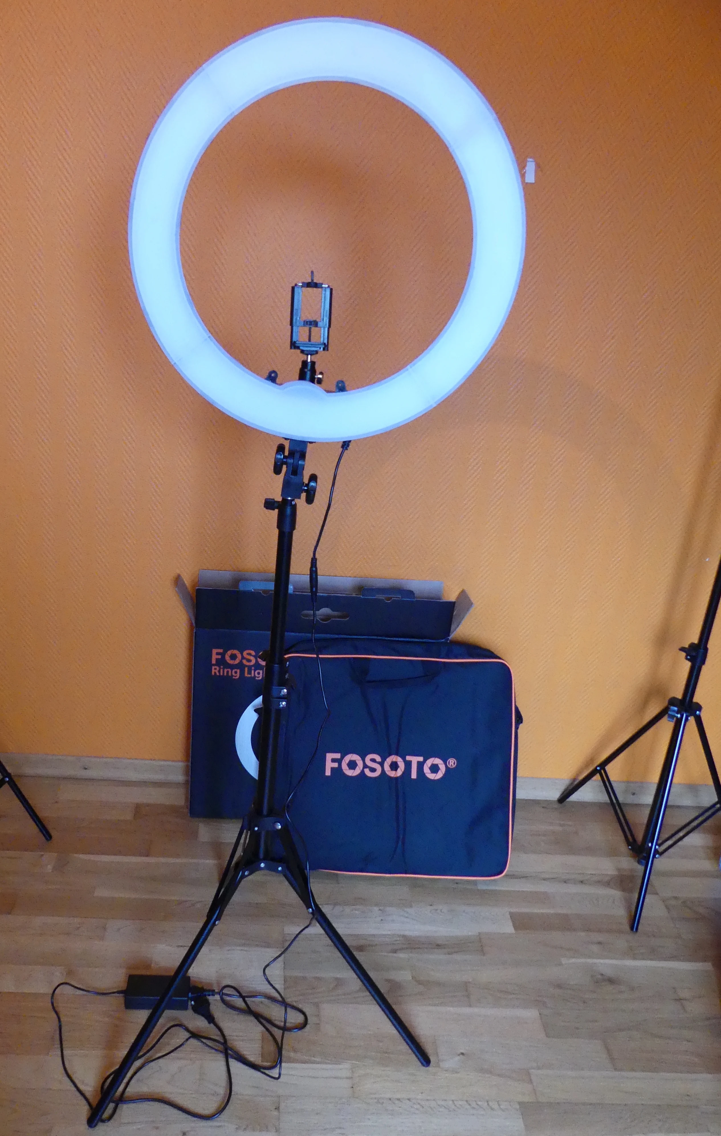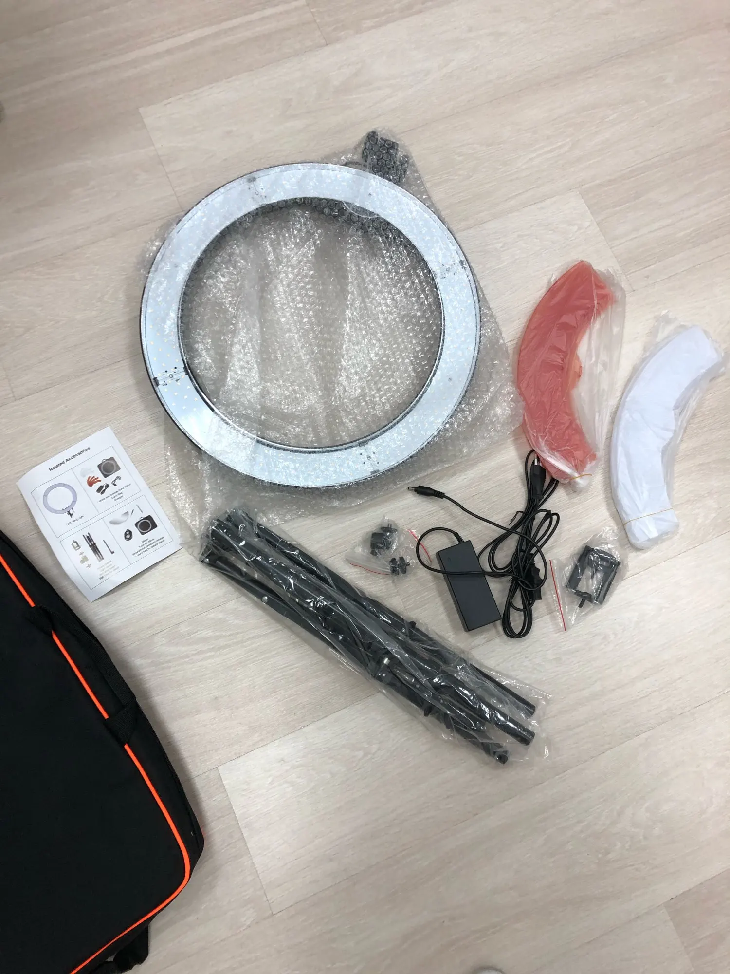 Только получила посылку и собрала лампу, в работе отлично. Свет регулируется по яркости и теплоте (желтые накладки в комплекте). Высота штатива регулируется тремя телескопическими трубками. Лампу купила за 5550,98 р. Очень быстрая доставка курьером до двери. Упаковка отличная, в комплекте сумка для переноски, держатель телефона и накладки для белого и жёлтого света. Единственный минус: где-то лампу замыкает и свет включается/выключается. Посмотрю по дальнейшей эксплуатации как поведёт себя.