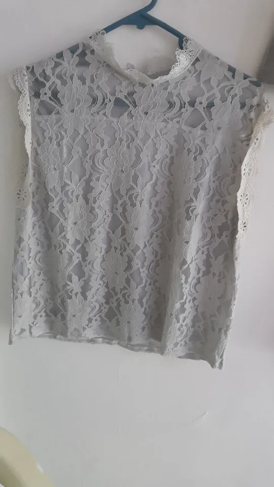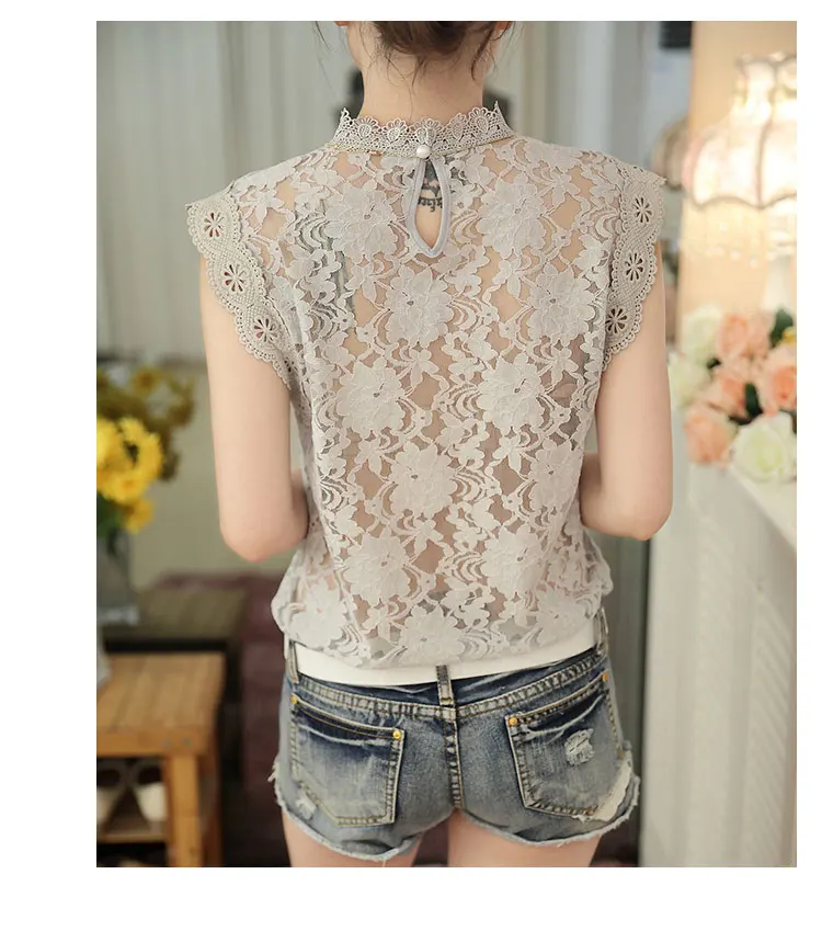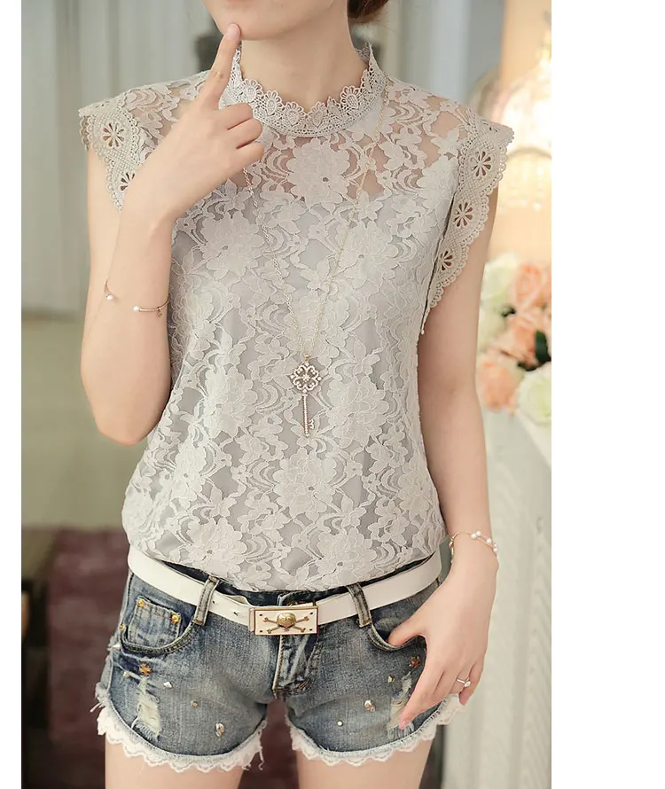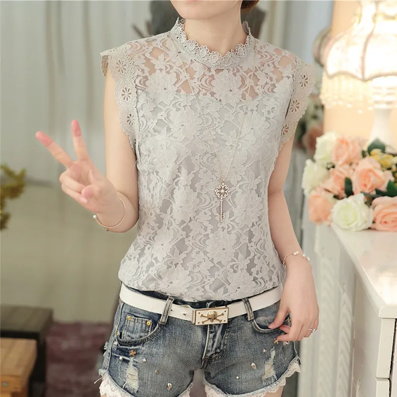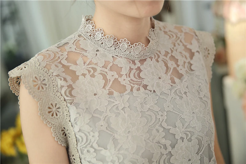 Женская кружевная блузка без рукавов, белаясерая приталенная блузка, модель 2017 59G 30 в Корейском стиле на лето, размера плюс