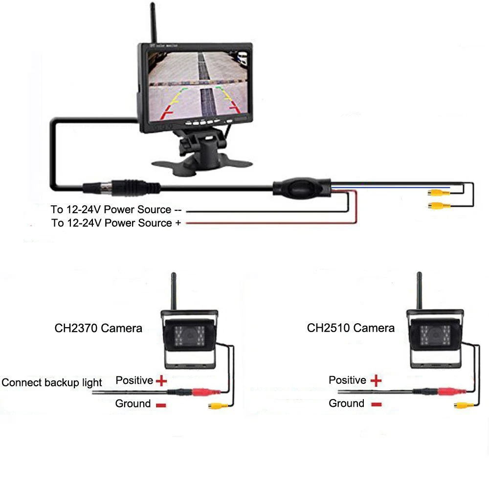 A: 1. Пожалуйста, выключите fm-радио, bluetooth, wifi или другой электронный продукт, чтобы избежать помех сигнала.2. Пожалуйста, нажмите 1-ю кнопку на мониторе или нажмите видео выбрать на Romote до AV2, который работает для беспроводной камеры. AV1 для проводной камеры.3. Есть 2 канала для камер: 2370 и 2510. Пожалуйста, переключите каждую из них, нажав 2-ю кнопку на мониторе или нажав модель выберите на пульте дистанционного управления.4. Для максимального сигнала направьте антенны друг к другу.5. Держите монитор и камеру на расстоянии около 2 метров, или камера и монитор будут мешать друг другу.