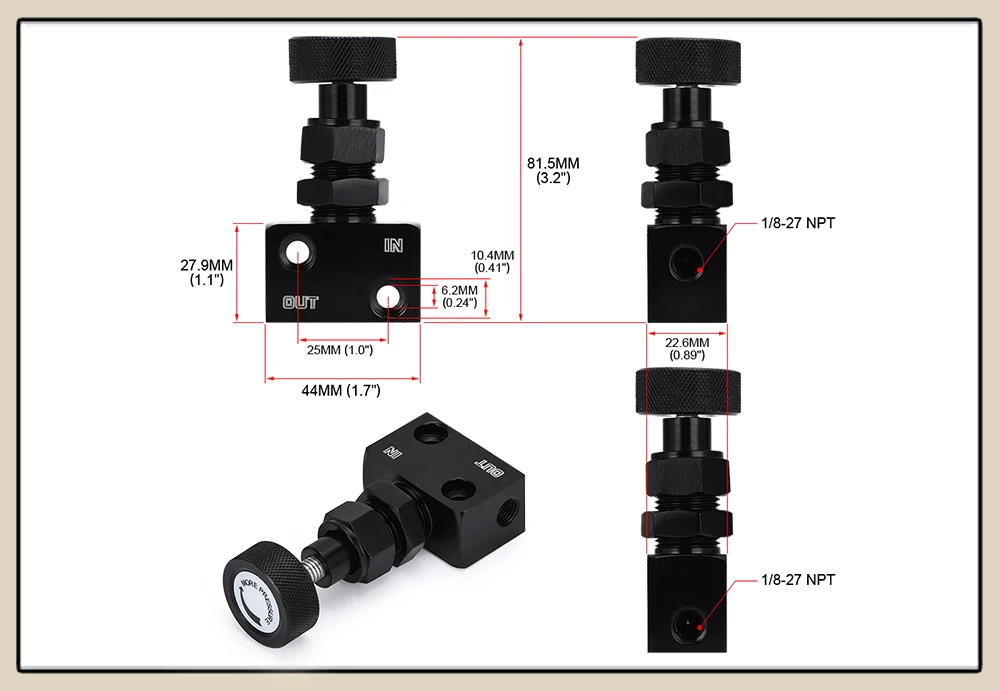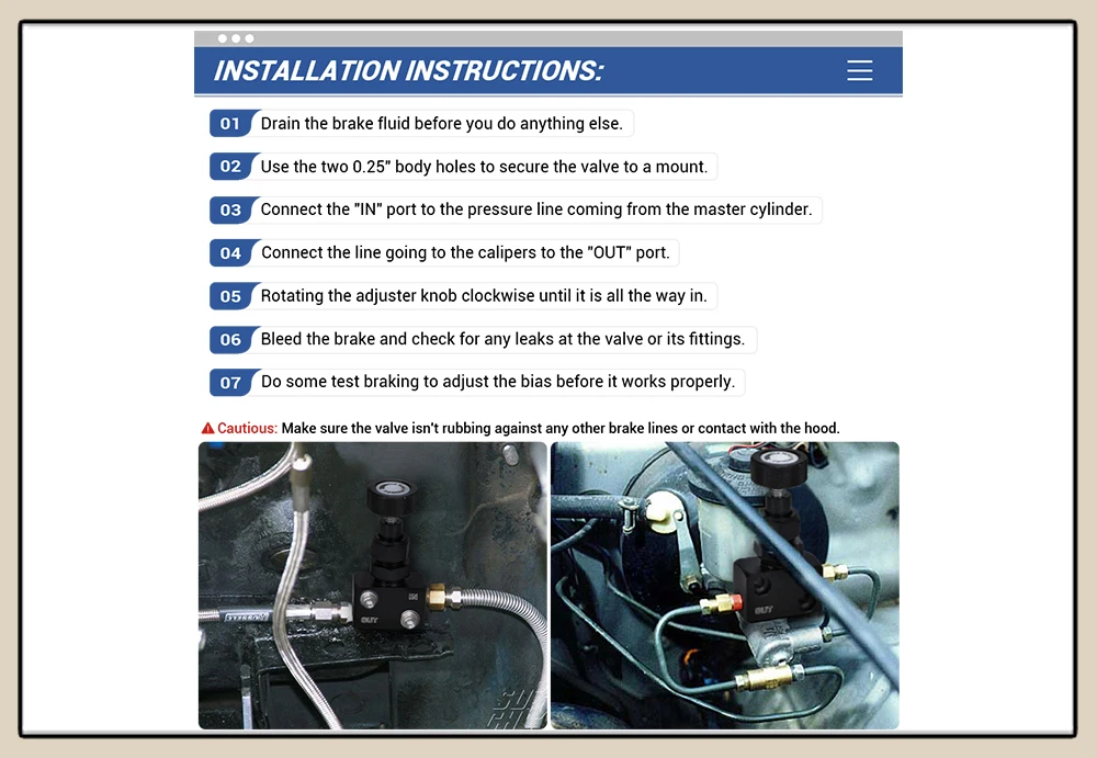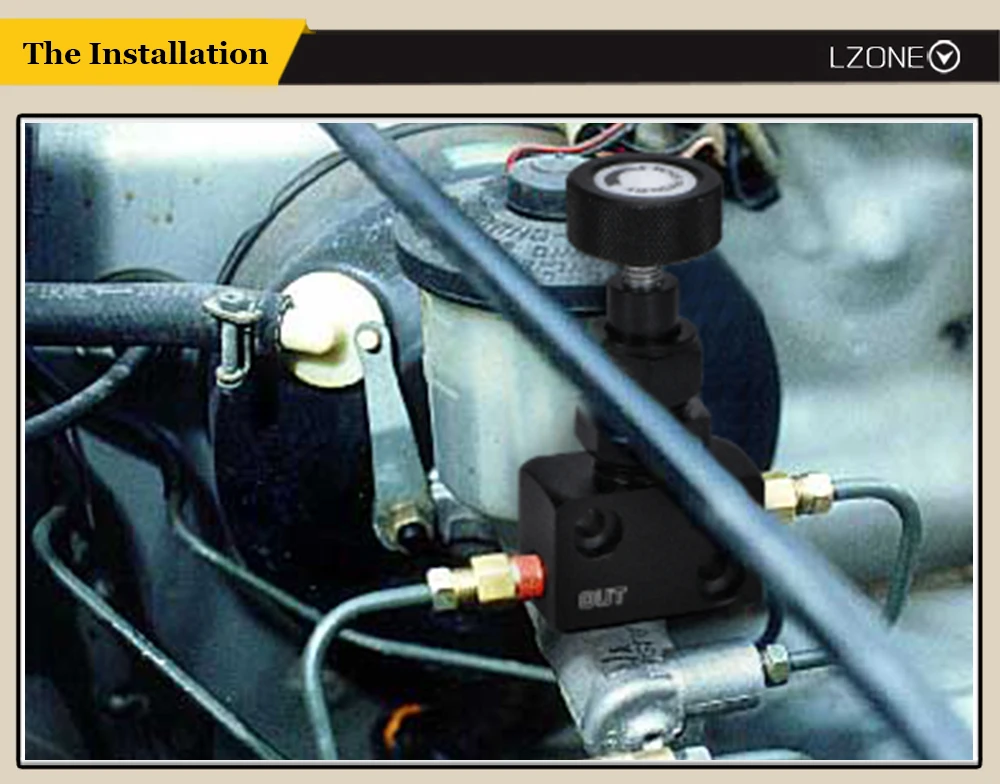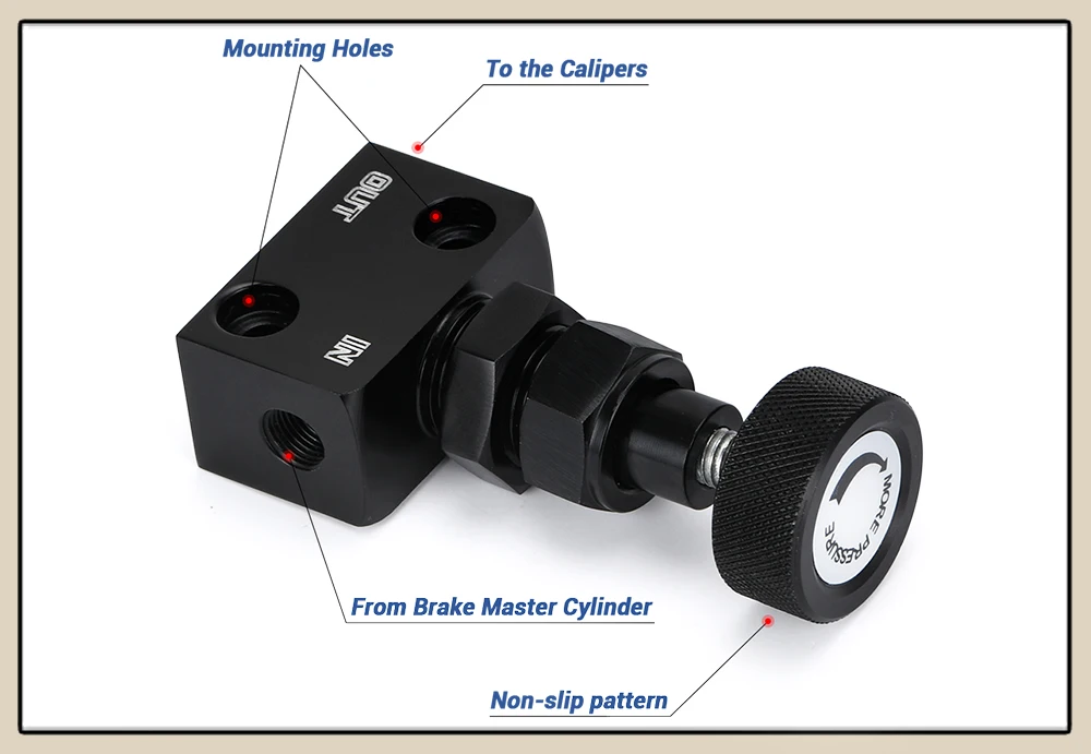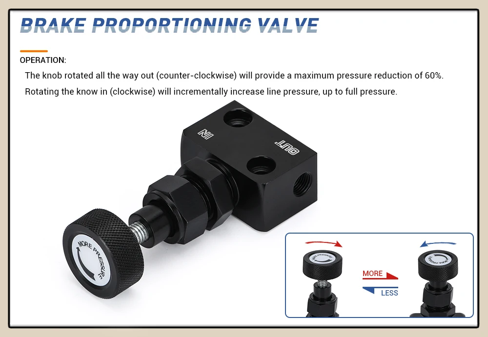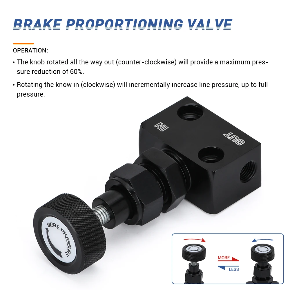 Осторожно:Убедитесь, что клапан не трется от любых других тормозных линий или не контактирует с капотом. Обеспечивает гораздо лучшую общую эффективность торможения.Эксплуатация:Ручка поворачивается на весь выход (против часовой стрелки) обеспечивает максимальное снижение давления на 60%.Вращение ноу в (по часовой стрелке) увеличивает давление линии до полного давления.