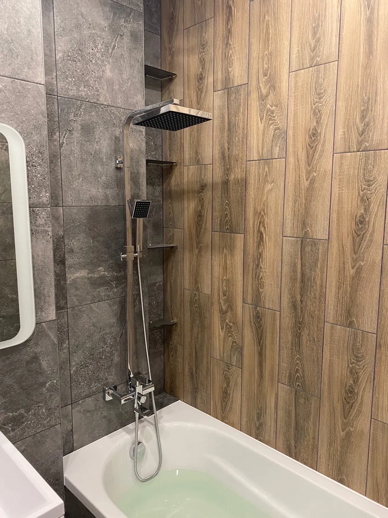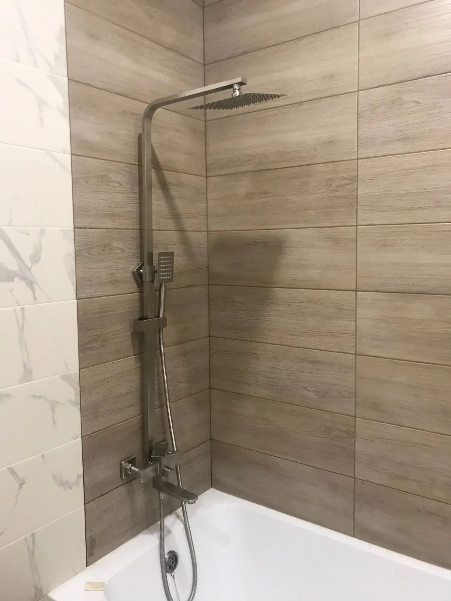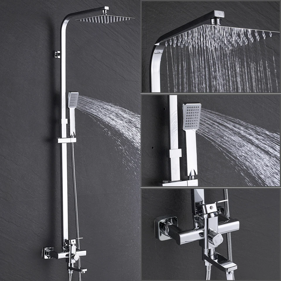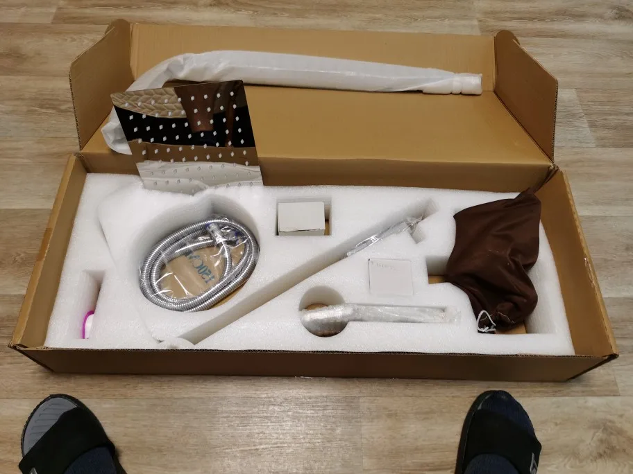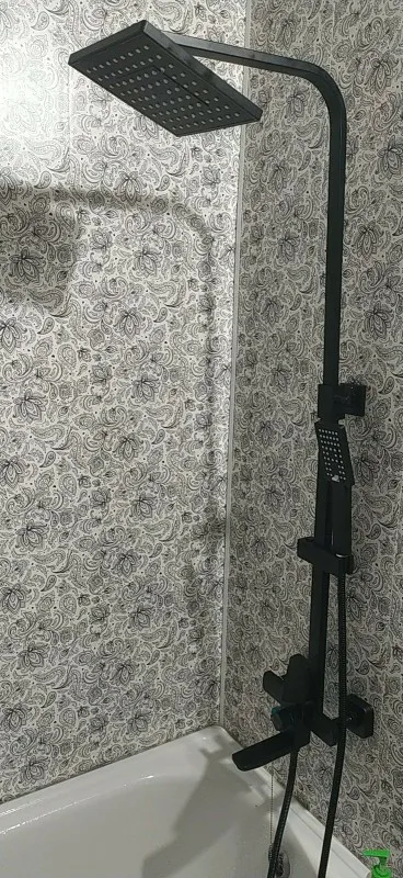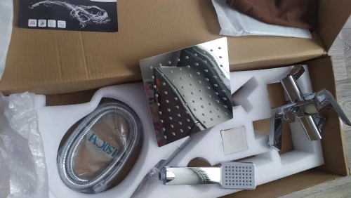 Быстра доставка до двери. Внушительная коробка, упакована хорошо. В комплекте все необходимое. Стоит особо отметить эксцентрики хорошего качества (57% меди). Квадратные накладки хорошего качества, плотные, легко накручивать. Сам смеситель неплохой и стильный. Приятные лейки, что верхняя, что на шланге. Мягкая регулировка напора. Не скачет температура воды. Нормально работает в режиме излива и в режиме лейки на шланге. Простое переключение между режимами. В режиме тропического душа подтекает с задней стороны в месте крепления основания для тропического душа. Не подходит под обычные ванные! Не проверил размеры максимальной высоты стойки для тропического душа, она слишком короткая. Выйти из ситуации получилось через удлинитель. Поэтому данный вариант идеально впишется в душевой кабине с регулировкой на уровне 110-130 см. Даже не смотрят на озвученные минусы, можно рассматривать к покупке.