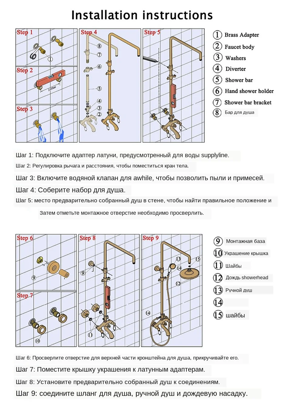 Отличный душ, описание точное, доставка до России чуть больше недели, по качеству ничем не хуже, чем в магазинах, только ценник на приличие отличается. Единственный минусик: чуточку слабоват напор в душевых лейка, а всё остальное просто супер. Спасибо большое продавцу, рекомендую