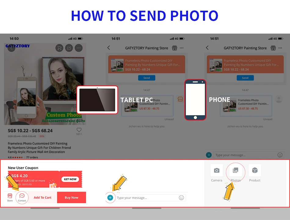 В сообщение где кнопка связаться с продавцом.пришдите ему своё фото