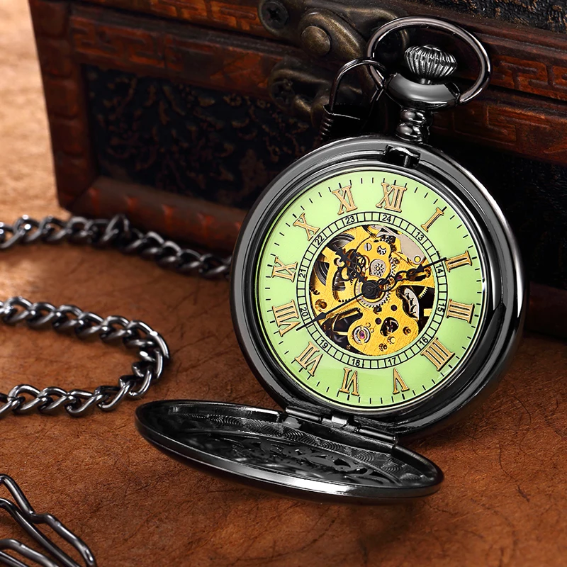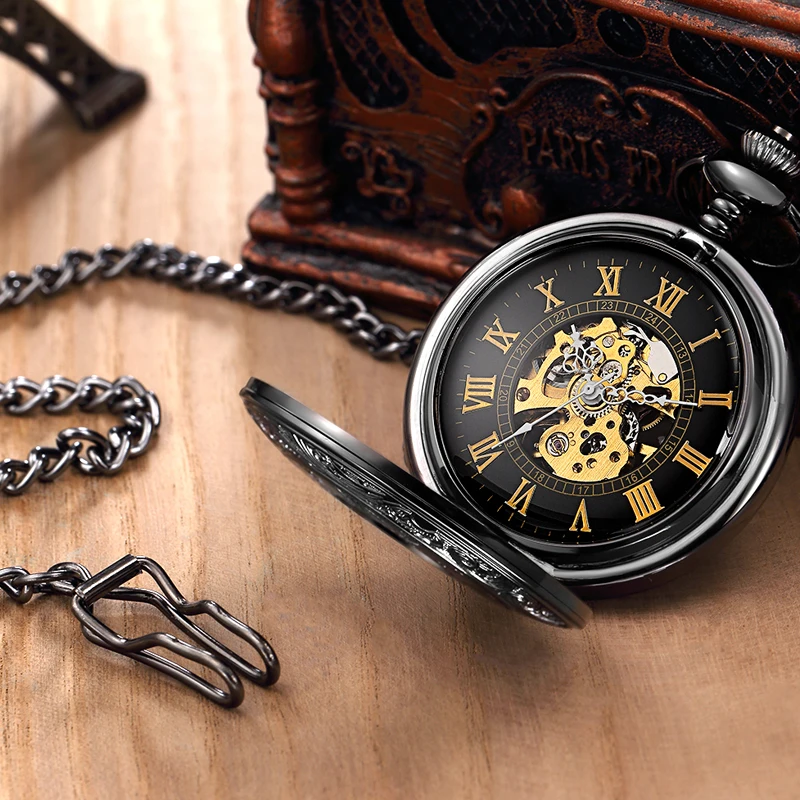 Мужские карманные часы W029B, черный циферблат под старину с золотым и римским циферблатом