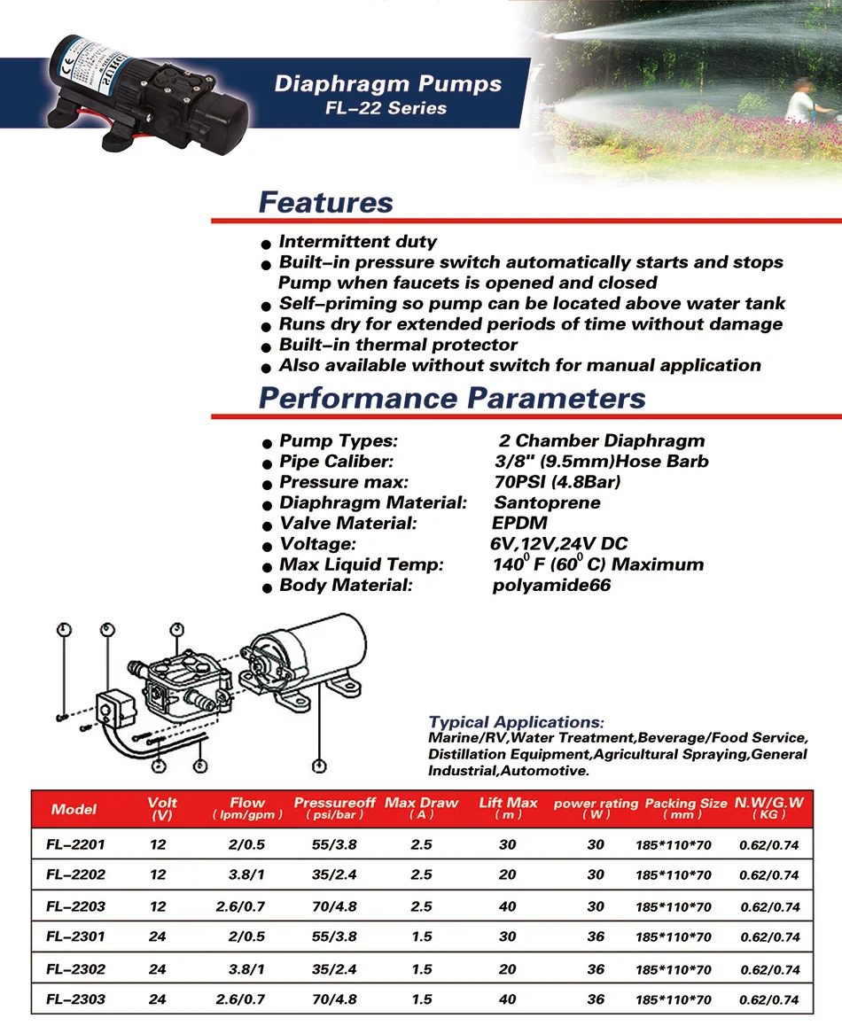 Выключение давления (PSI)Максимальный подъем (м)1. Мини мембранный насосFL-3012V/24V1017PSI10 мClike, чтобы купитьFL-32110V/220V12,535PSI20 мClike, чтобы купитьFL-3412V/24V12,535PSI20 мClike, чтобы купитьFL-4012V/24V1740PSI25 мClike, чтобы купитьFL-41110V/220V1740PSI25 мClike, чтобы купить2. Компактный сельскохозяйственный мембранный насосFL-220112V/24V2-2,635-80PSI30 мClike, чтобы купитьFL-220212V/24V2-3,135-80PSI20 мClike, чтобы купитьFL-220312V/24V2,680PSI40 мClike, чтобы купить3.Гибкий насос крыльчаткиFIP-320012V/24V23\3 мClike, чтобы купить4. Высоконапорный мембранный насосDP-6012 В660PSI35 мClike, чтобы купитьDP-8012 В5,880PSI50 мClike, чтобы купитьDP-10012 В5,6100PSI60 мClike, чтобы купитьDP-12012 В5,3120PSI70 мClike, чтобы купитьDP-16012 В5,1160PSI95 мClike, чтобы купитьDP-120S220V5,3120PSI70 мClike, чтобы купитьDP-160S220V5,1160PSI95 мClike, чтобы купить5.Треугольный насосFL-70112V/24V1150PSI15 мClike, чтобы купитьFL-70312V/24V825PSI30 мClike, чтобы купить6.Насос для сточных водMP-450012V/24V45\\Clike, чтобы купить7.Насос для промывкиFL-10012V/24V13100PSI60 мClike, чтобы купить8. Солнечный насосSP-1212V/24V6\70 мClike, чтобы купить