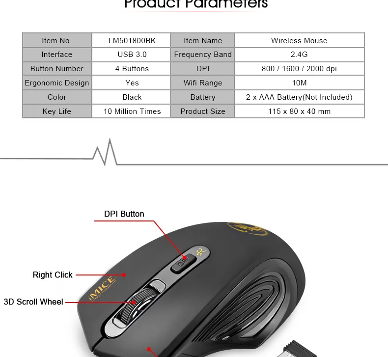 Мышь iMice беспроводная, 4 кнопки, 2000DPI, 2,4 ГГц, USB, эргономичная, бесшумная