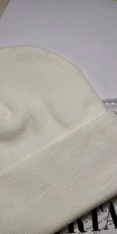 Стандартная шапочка, акрил, лоб не чешется, двойная с подворотом. Цвет не чисто белый. На сильные морозы естественно продувается. Хорошо тянется, подойдёт и на голову побольше, во время носки немного ползёт вверх. Посмотрим что будет после стирки