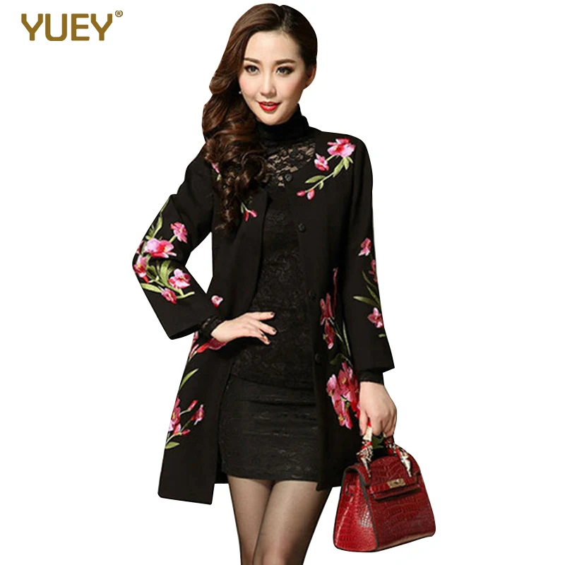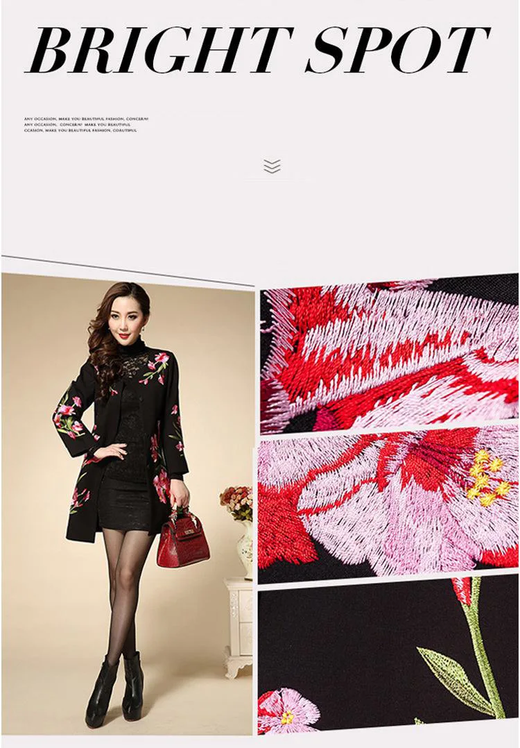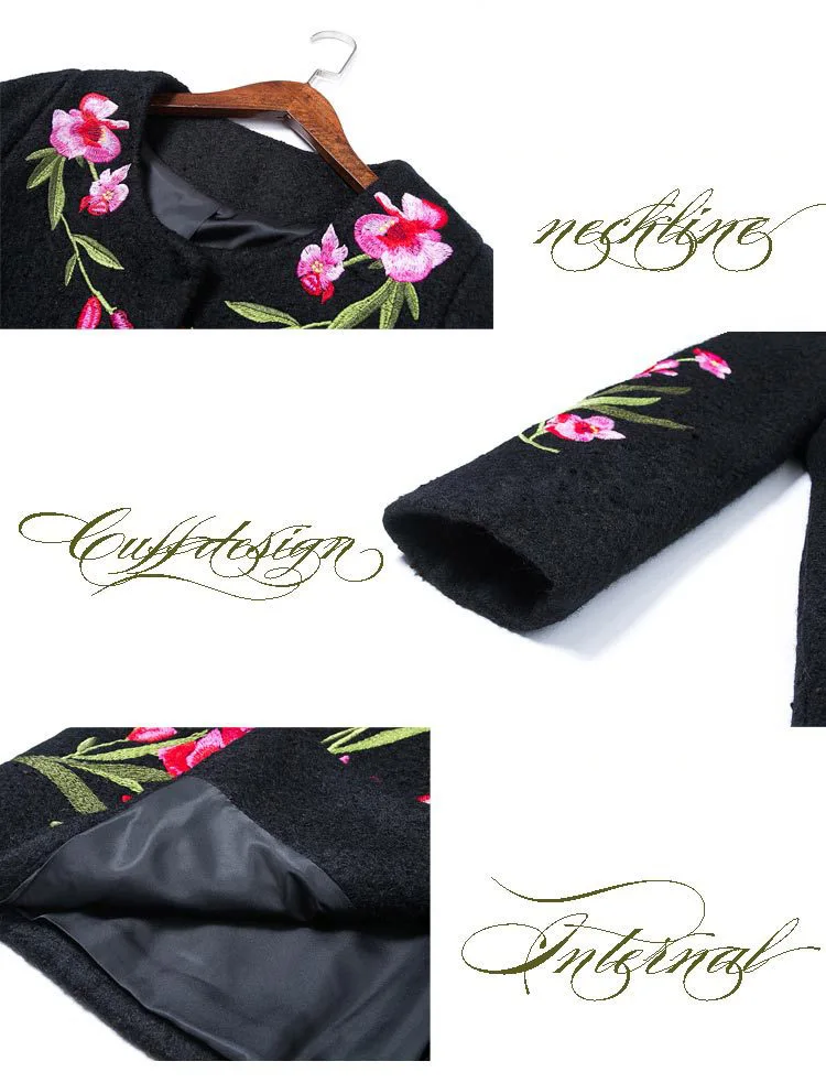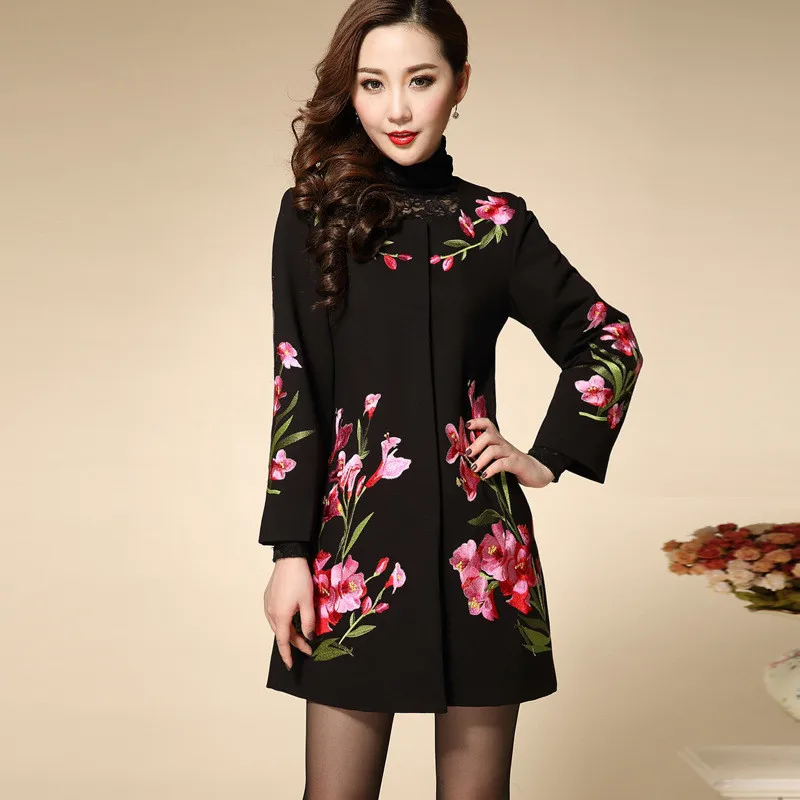 Женское жаккардовое шерстяное пальто, Черное длинное пальто с вышивкой и цветочным принтом, размеры от M до 4XL, Осень-зима