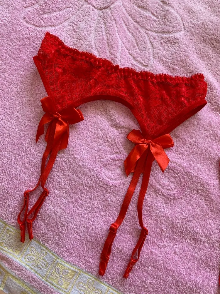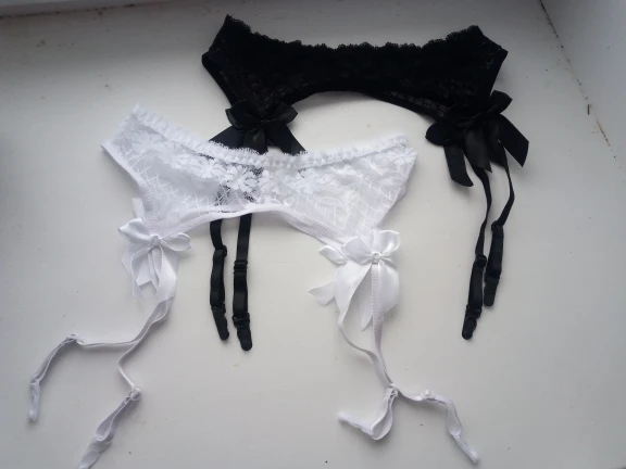 подвязки очень красивые пишиты качественно, нитки не торчат чулки держат хорошо на не широкую талию талию на мою 75 подошли идеально на лезут и на поболее талию