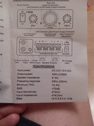 Nice little amp. Connected it to a old speakers, and now playing electric piano :) Shipping is fast, Quality is good.