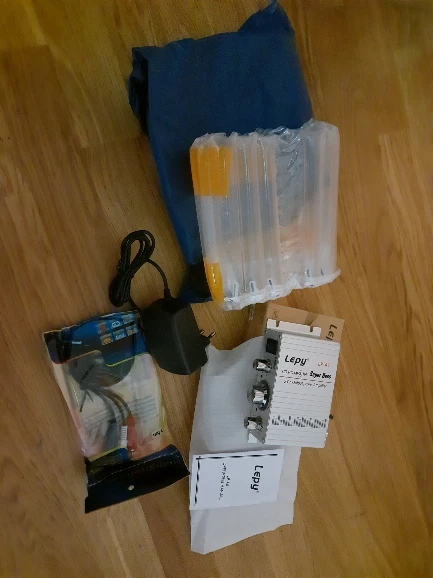 Пришло довольно быстро , пришло хорошо упаковано. В комплекте сам усилитель, блок питания, шнур 3.5Jack - 2RCA. На удивление работает. Полочники недорогие играют неплохо.