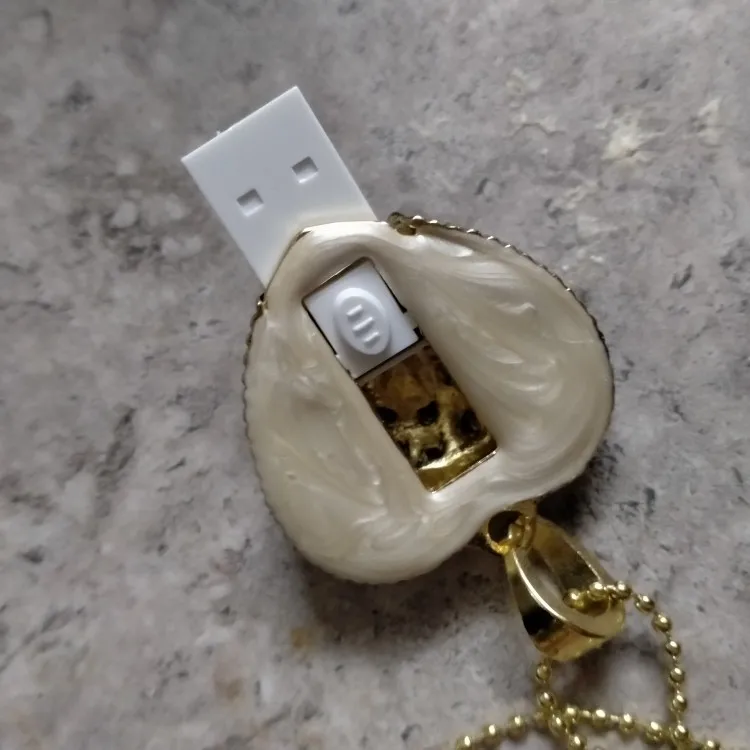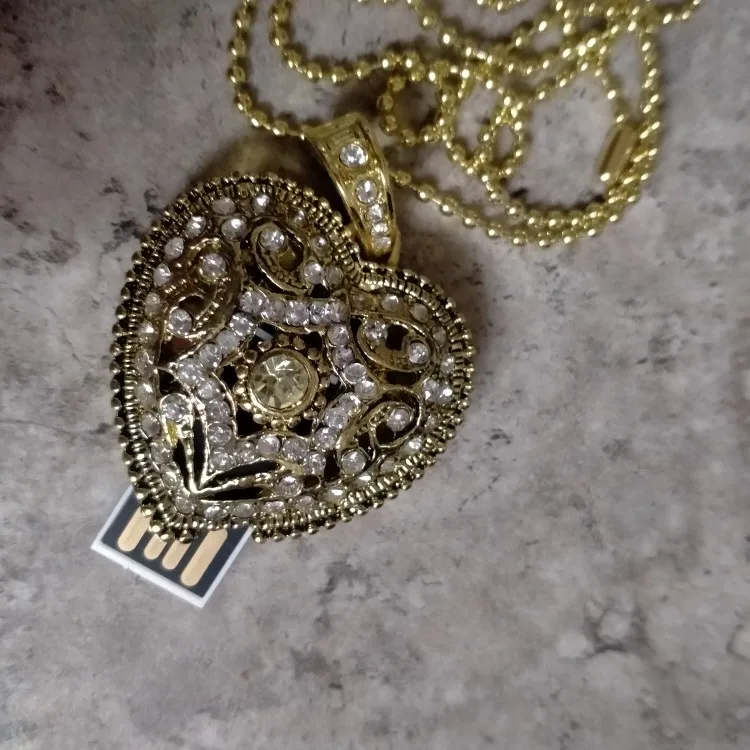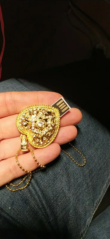 Однажды уже подобную флешку заказывала, но у другого продавца. Та мне послужила долго, пока не потеряла. По сравнению с той, эта флешка намного более хлипкая, легче по весу, сама флешка внутри сердца уже шатается, пластиковая. Сделана из более жёлтого металла, цепочка так же производит впечатление хлипкой. Жаль, надеялась на то же качество. Из 64 Гб в компе определяется свободными 58,5 Гб.