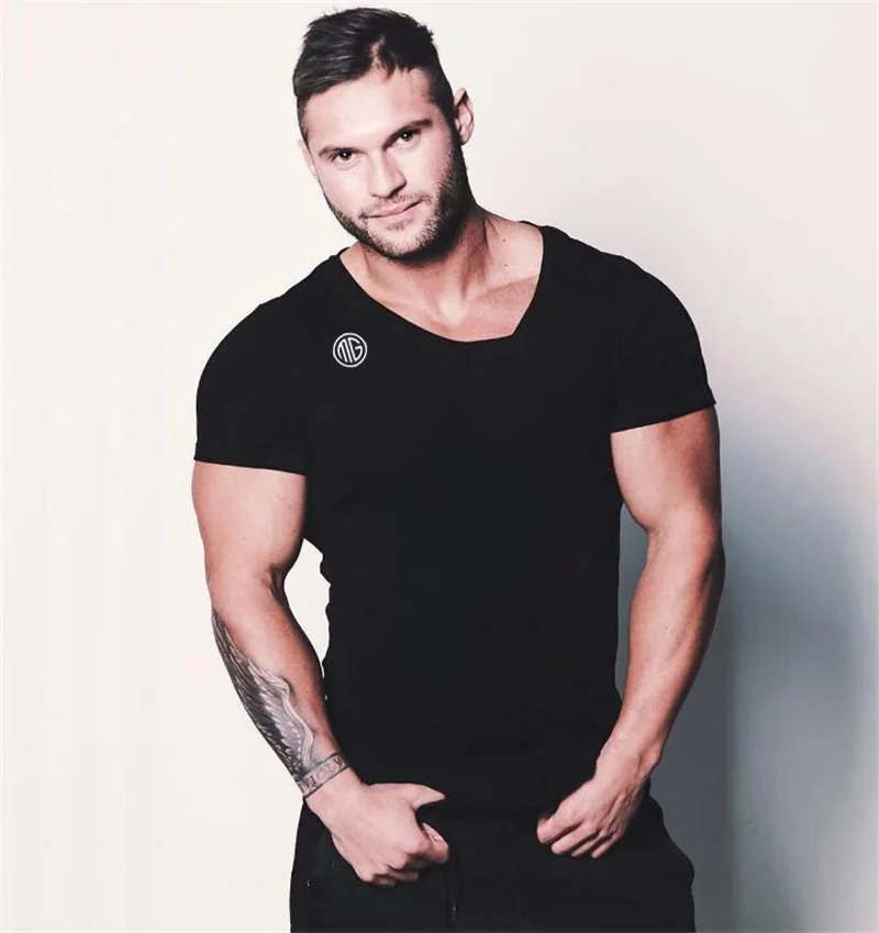 2020 летняя Модная брендовая футболка, мужская спортивная одежда с v-образным вырезом и коротким рукавом, облегающая футболка, Мужская компрессионная футболка Ftiness homme