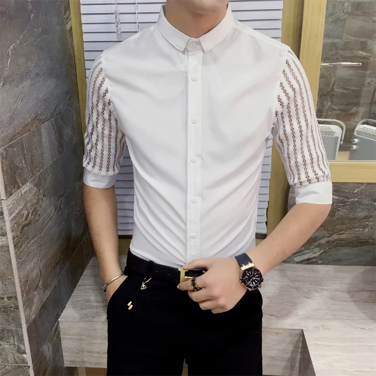 Мужская прозрачная рубашка, черная, белая, кружевная, для выпускного вечера