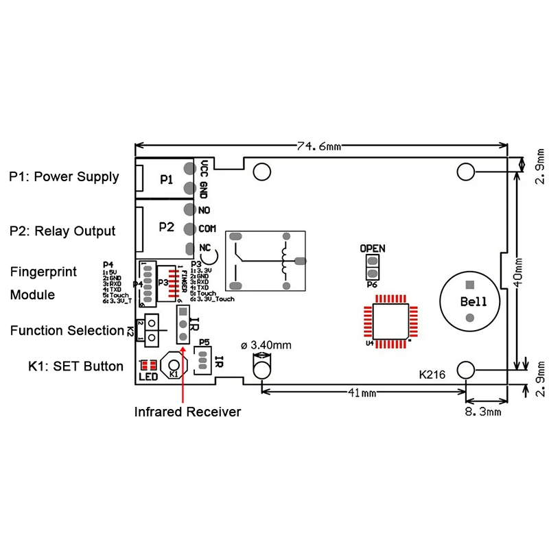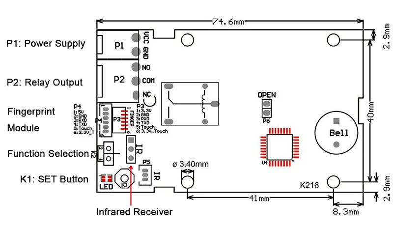 Функция реле:1-20s или реле закрыто, когда отпечаток пальца прошел, реле будет открыто при снятии пальца.